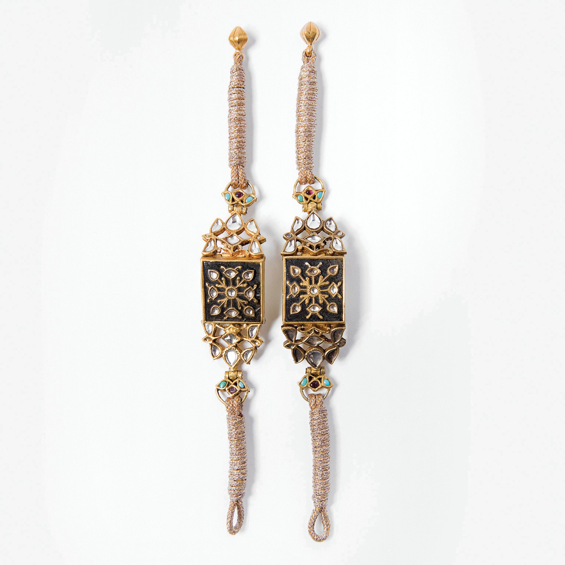 Bands such as these, embellished with gemstones sel ected for their supposed powers to ward off ill effects, were worn on the upper arm as talismans to protect the wearer in battle. The Mughals adopted the tradition from the mighty Timurids. Later, as their decoration became more extravagant, Banj bands were used to flaunt the wearer’s wealth and political clout. This example features rock crystals, turquoise and rubies in a traditional gold Kendal setting. A similar piece is illustrated in an album of jewellery designs commissioned by Shuja-ud-Daula, the ruler of Faizabad, from the French adventurer Jean Baptiste Gentile in 1771. The Dutch dealer Van Gelder, which specialises in historical Indian jewellery, is asking €19,800 for the pair.