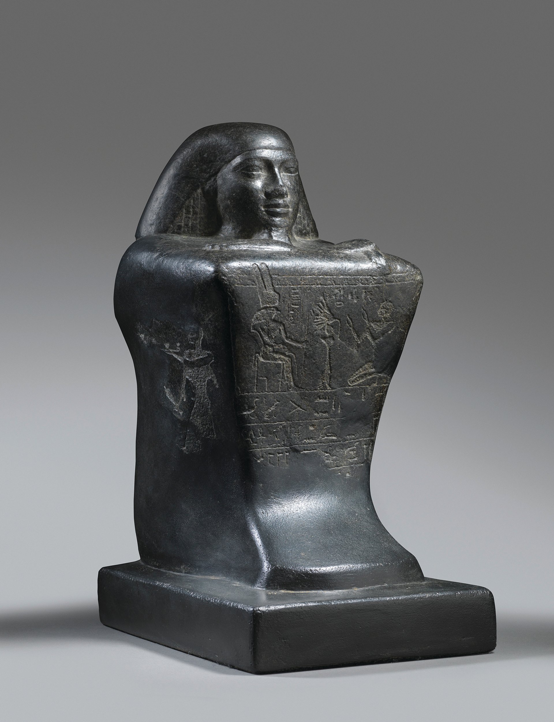 Block statues such as this, in which the deceased are shown seated with their knees drawn up, first appear in the Middle Kingdom and are fairly common by the Late Period. More than 350 block statues, 17,000 bronzes and around 400 other stone sculptures were unearthed by the French Egyptologist Georges Legrain in 1903, beneath the courtyard of the Temple of Amun within the Karnak Temple Complex. A block statue of Pamiu (which translates as cat), who held the titles of prophet and priest of the god Amun at Karnak, was among the cache; the piece is now in the Cairo Museum. This example, being offered by the London-based dealer Rupert Wace, is a second sculpture of Pamiu and is thought to be from the Chapel of Montu in North Karnak. It comes from the descendants of the French Egyptologist Alexandre Varille (1909-51). Its asking price is €1.25m.