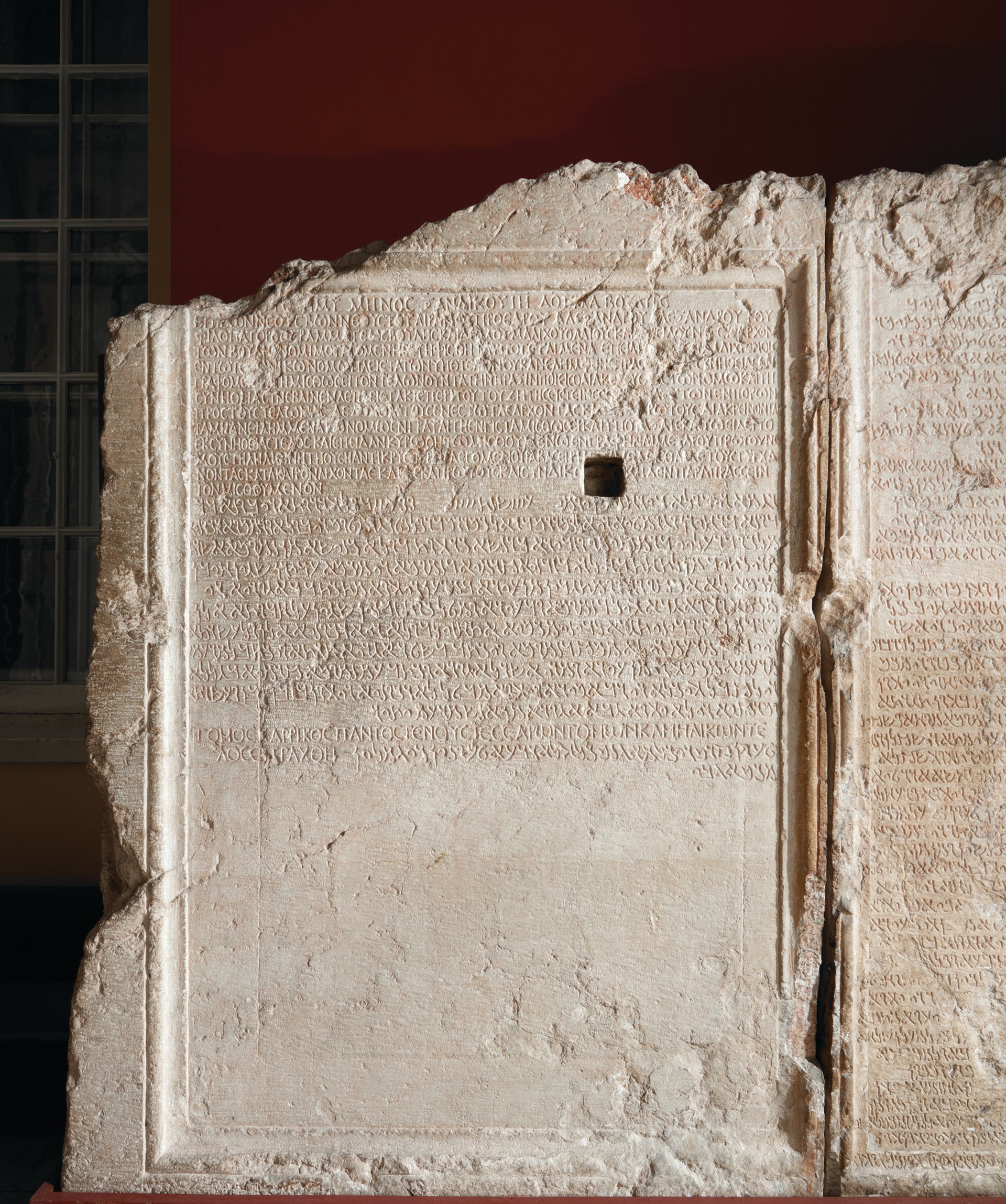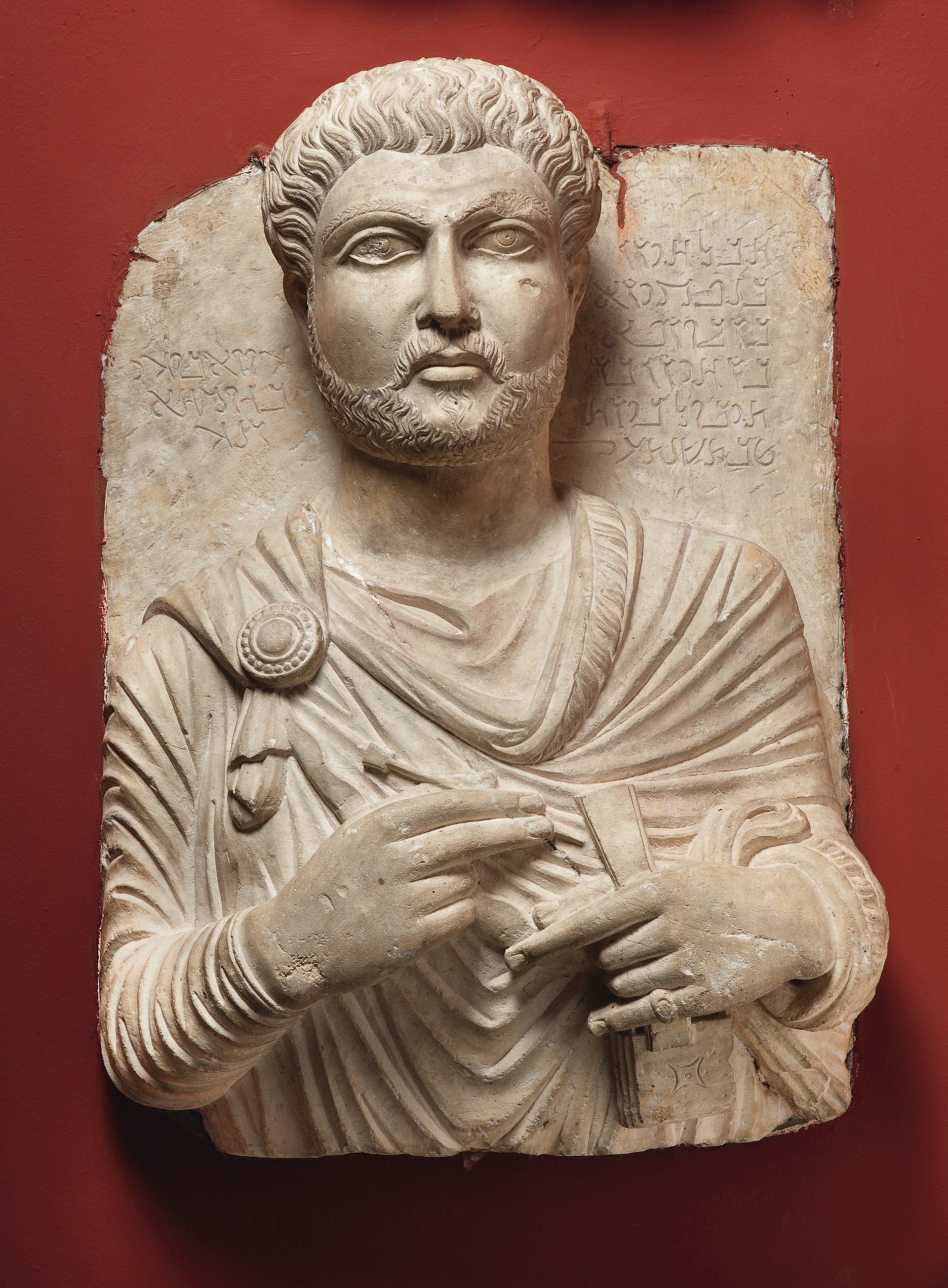 The six-metre long marble Palmyrian Tariff (AD137) documented import and export fees in Greek and Aramaic script. Palmyra was at the crossroads of trade routes linking India, Arabia and Iran. The tariff was found in Syria in 1881 by a wealthy Russian-Armenian explorer. It was given to the Russian Emperor as a gift from the Turkish Sultan, but made it to St Petersburg only after being stuck in Russian customs for two years. It is one of the oldest surviving artefacts from Palmyra.
