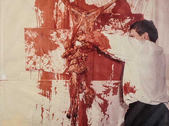 Günter Brus (born 1938) leaves little to the imagination. In 1968, he staged a performance at the University of Vienna with fellow artists Otto Mühl, Oswald Wiener, Franz Kaltenbäck and Peter Weibel: Brus cut his chest and thigh, smeared himself in excrement, drank his own urine and sang the Austrian national anthem while masturbating. He was promptly arrested and given a six-month prison sentence.