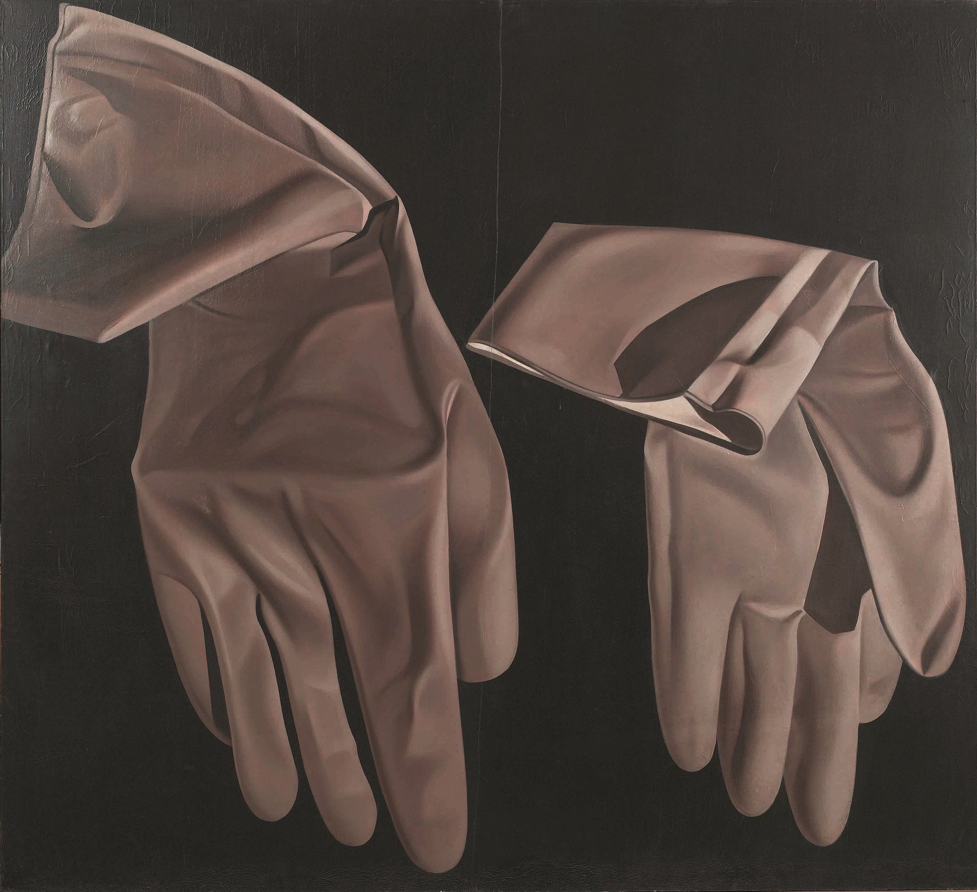 This monochrome painting of medical latex gloves is from Zhang Peili’s X? series, for which he aimed to produce dozens of nearly identical paintings by reducing technical and compositional changes to a minimum, to make the works seem like prints. In the end, he created around ten, but he also wrote a manual with rules for reproducing the series. The mechanical approach and clinical subject challenge Modernist ideas of art as self-expression. In 1986, Zhang and Geng Jianyi co-founded the artist group Pond Society, in Hangzhou. The collective’s goal was to deliver art from an academic context into public space through happenings, installations and collaborative works.