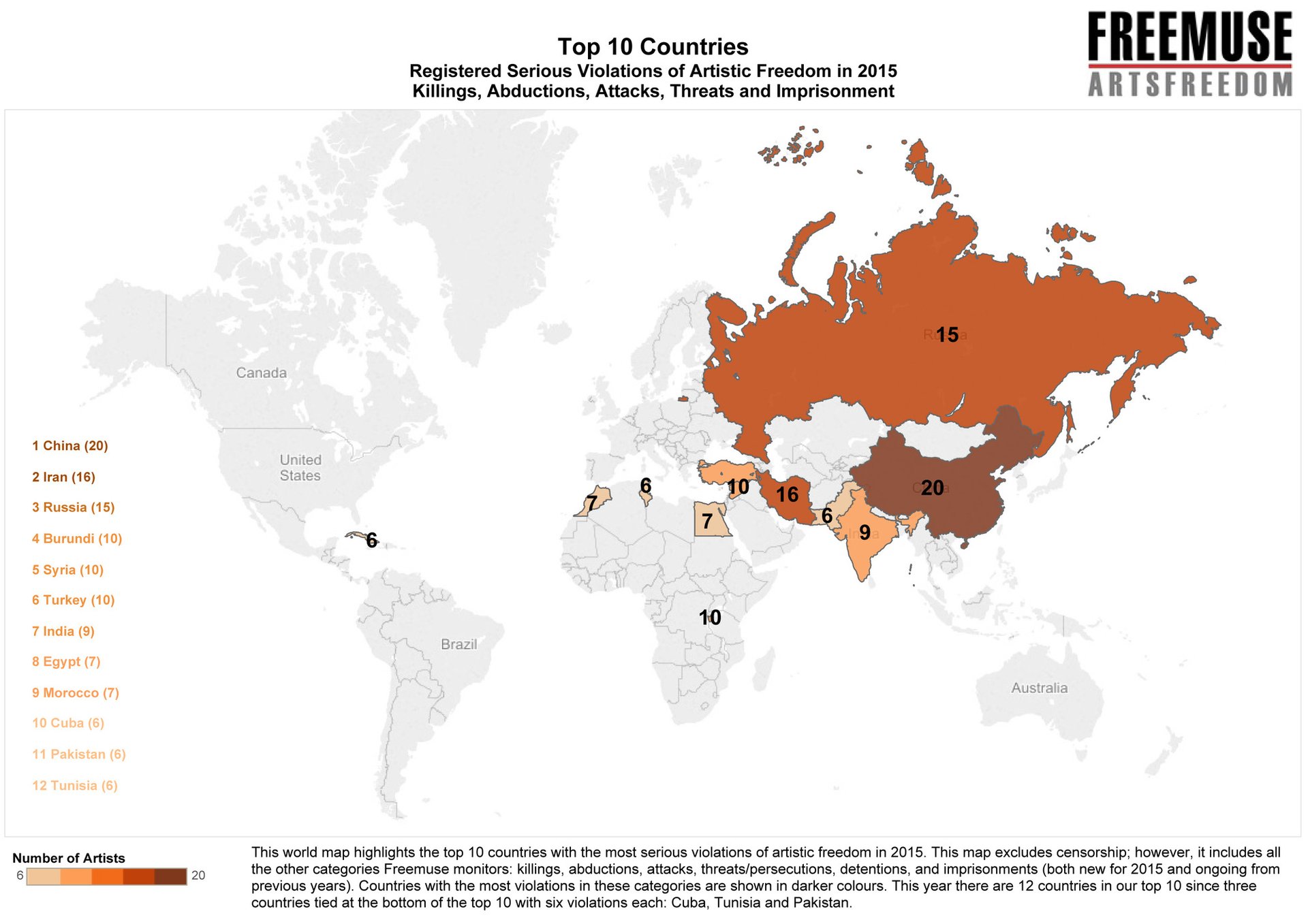 A study the group conducted, based on media reports and other sources, found that there were 469 cases of attacks on artistic expression last year, almost double the count in 2014. Most of the cases were issues of censorship (292), though the total also includes incidents of artists being detained (23), prosecuted (42), physically attacked (24), or even killed (3). Among the worst offenders last year were authoritarian governments, with China having registered 20 “serious violations”, followed by Iran (16) and Russia (15). The reasons for and types of restrictions on expression detailed in the study are multifarious—headings include “Turkey: Terror Legislation and a Thin-Skinned President” and “Egypt: Censorship Stifles Artistic Freedom”.