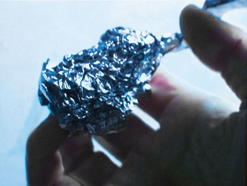 The bioreactor also affects elements of the show's Chelsea iteration, which climaxes in a new, 16-minute video, Li-Yan (2016). The movie renders strange various parts of New York, like Flushing Meadows–Corona Park, through expressionistic sound editing and cinematography. Perspective jumps between the first and third person omniscient—objects are always way too close or way too far—so you're always at an odd proximity to whatever is actually happening. This builds to a light show that brings to mind the alien ship in Steven Spielberg's 1977 film Close Encounters of the Third Kind.