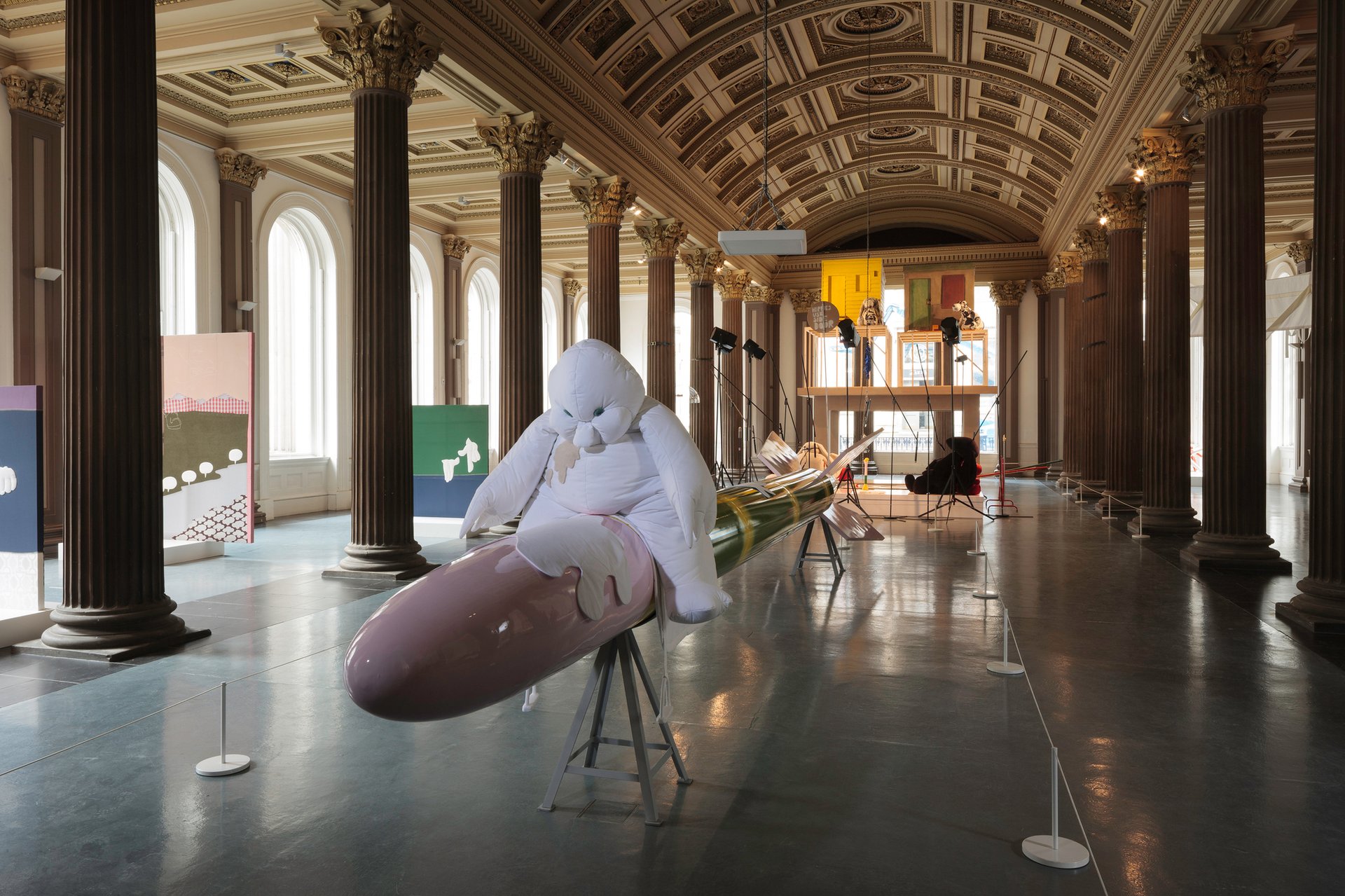 Scaled-up soft marine creatures by Cosima von Bonin bring some seaside surrealism to the main hall of Glasgow Museum of Art as they loll and loom on loungers, low plinths and—in the case of one ominous fat stuffed bird—straddle a giant rocket missile. They are more boisterously cartoonish than unsettling, although there’s a malevolence to the tweed octopus whose tentacles end in savagely pointed glass curlicues, and the pair of clams balancing on twin skateboards, with eyeballs peeping from their half-open shells.