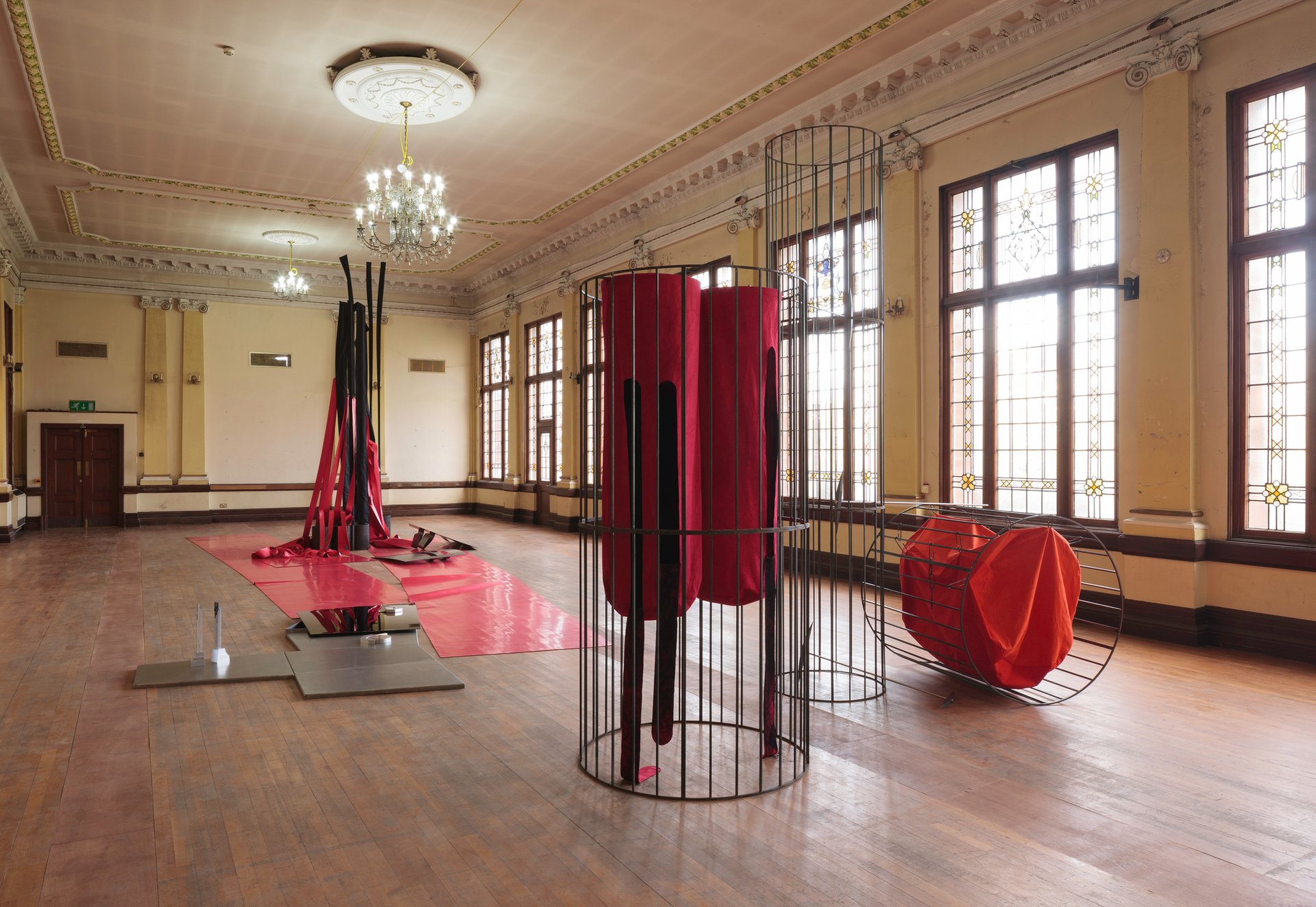 The derelict, decaying Kelvin Hall used to house circuses as well as trade and industrial exhibitions. In the peeling former grandeur of an upstairs function room, Clare Barclay’s extensive, suggestive installation uses lengths and cascades of pink rubber; caged red-canvas sacks spitting coal dust; drilled machine parts and sheets of metal puddled with coal tar to filter the building’s past ghosts through the formal language of 20th century abstract sculpture.