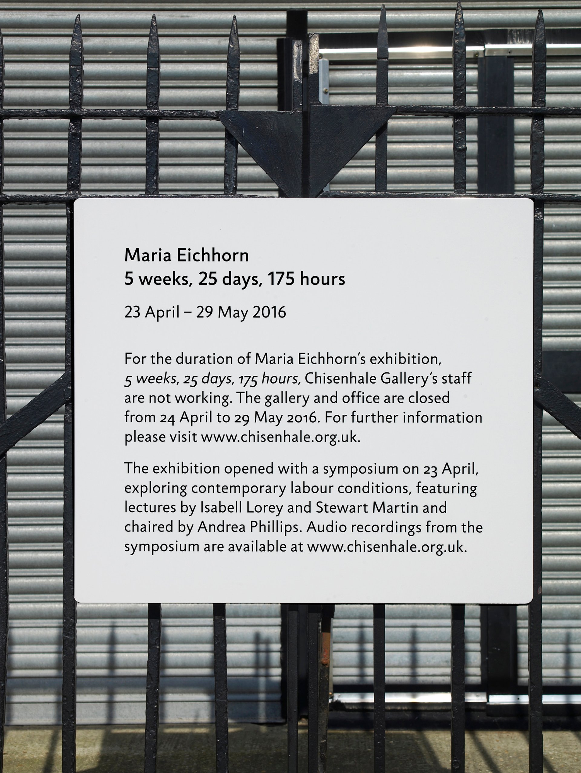 For the next five weeks anyone turning up to the Chisenhale Gallery will be met by closed shutters, locked gates and a notice stating: “For the duration of Maria Eichhorn’s exhibition, 5 weeks, 25 days, 175 hours, Chisenhale Gallery’s staff are not working. The gallery and office are closed from 24 April to 29 May 2016.”