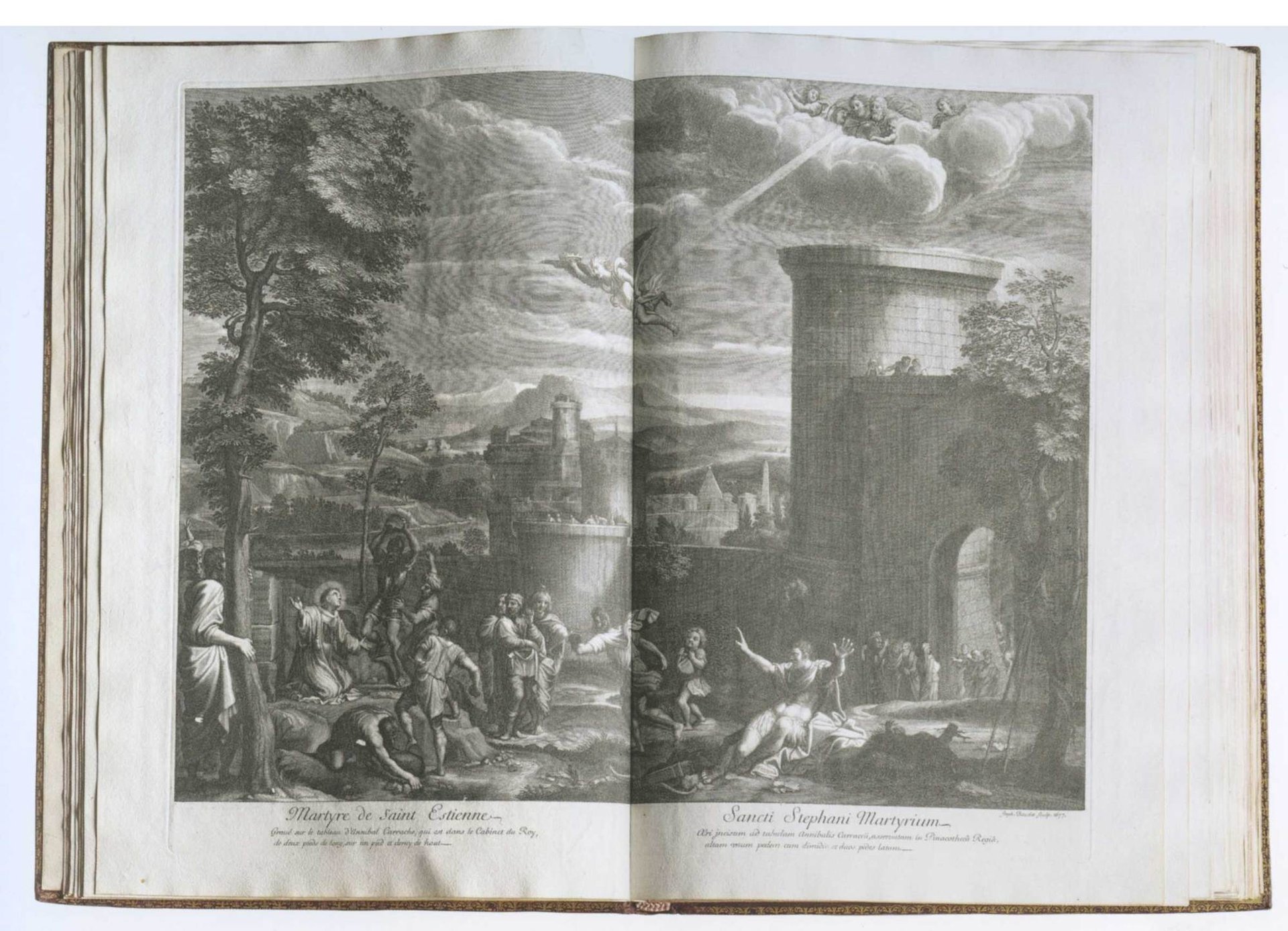 Never to be surpassed, Louis XIV caused his finance minister and secretary of state, Jean-Baptiste Colbert, to make a royal Galeriewerk, but, of course, on a far grander scale than that of his Hapsburg near neighbour. The first volume of the Tableaux du Cabinet du Roy appeared in 1677 followed by ten more, the plates depicting all “departments” of the royal collection: medals and medallions, sculptures, both ancient and modern, the grotto at Versailles, and pictures of the various royal palaces and gardens. Included as well were paintings: for example, Annibale Carracci’s The Stoning of Stephen (1683) in the Louvre palace, which, with its double-page spread, is typical of the lavish treatment allotted to the works in the Tableaux. The initial print run was for Louis’s own disposal, but in 1679 Colbert made the books available to the public supposedly to demonstrate the King’s generosity and the growth of the arts in France. The Tableaux, like many of the Galeriewerke, was a publishing failure as the production costs far exceeded sales.
