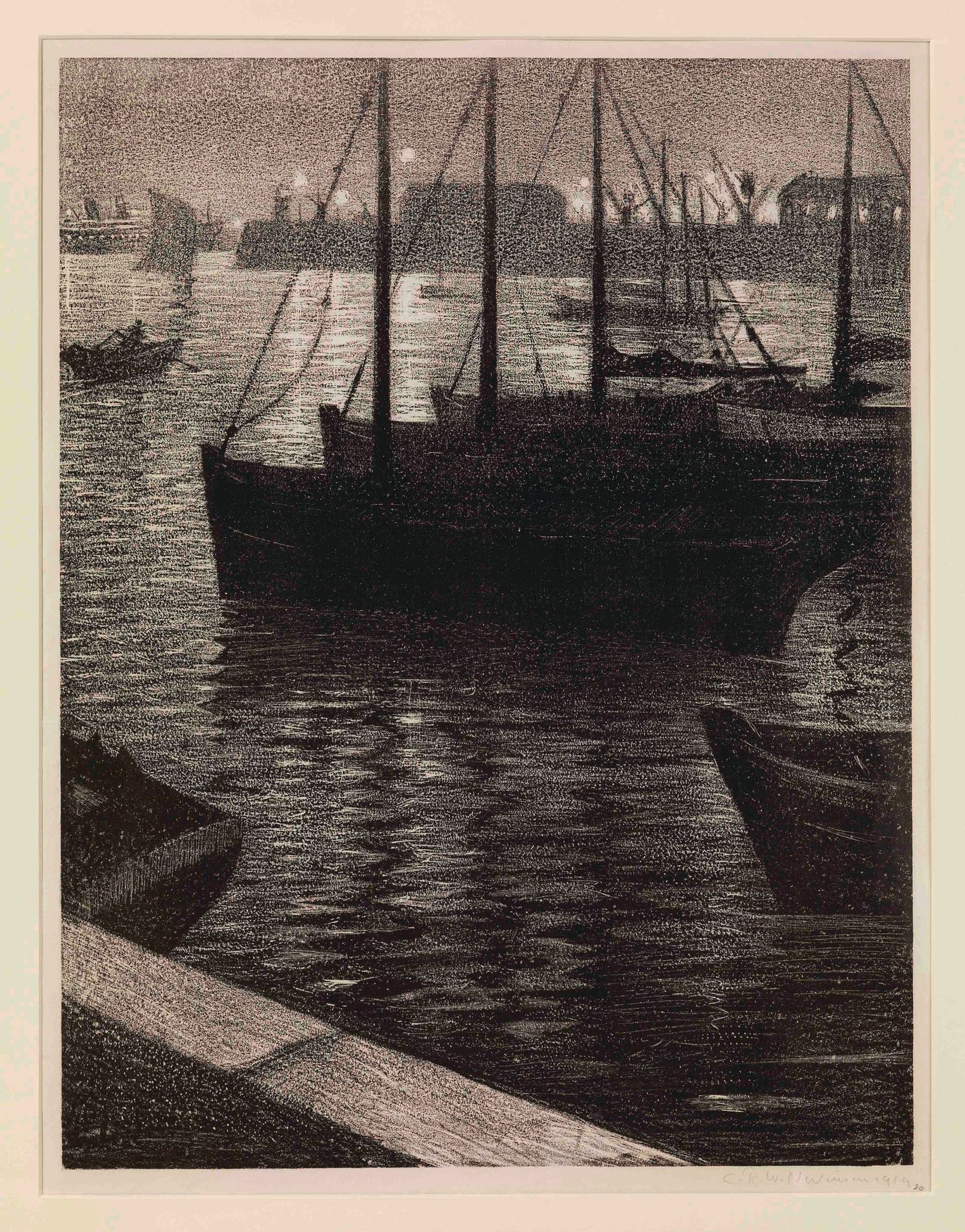 At the inception of the London Original Print Fair in 1985, the bias was towards Old Masters but the pendulum has now swung to Modern and contemporary. The fair’s founder, Gordon Cooke, is also exhibiting as the director of the Fine Art Society and will be bringing this lithograph of a port by the 20th-century British artist Christopher Richard Wynne Nevinson. The port is probably Cherbourg, where Nevinson arrived in November 1918 on his way to Paris. The ships are shown using their lights for the first time since before the First World War, as black-out regulations were relaxed after the Armistice.