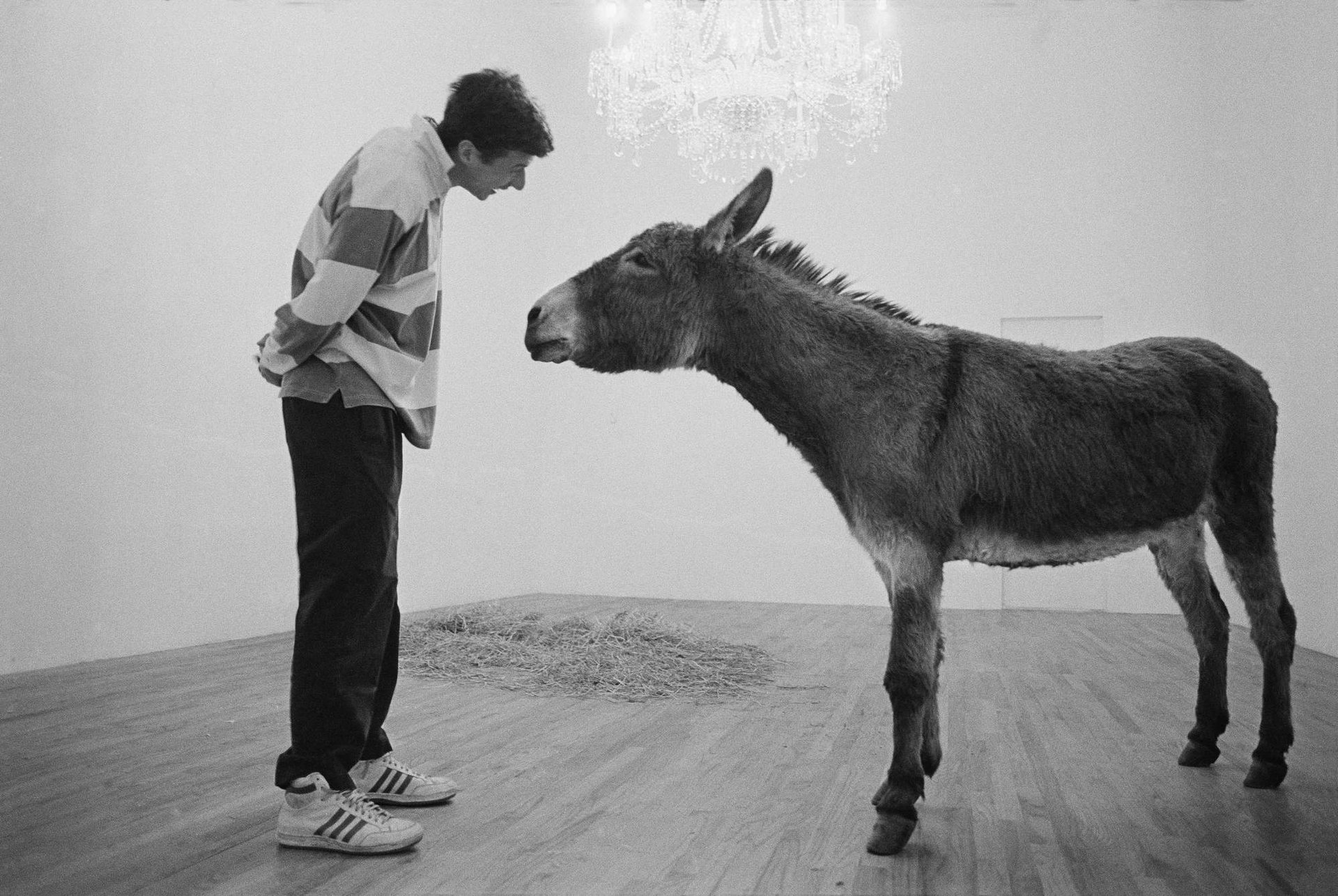 Cattelan fondly recalls carting the original donkey from Connecticut to Manhattan: “I remember it was a Friday, back in May 1994, and we went up to Connecticut, with Daniel and his wife, to get a donkey. Daniel retrofitted an old Ford pickup truck with some wooden slabs that could function as a makeshift trailer. When we got back to the city, driving down Fifth Avenue, with the sunset lights on one side and luxury cars all around us, it felt like a triumphant entrance in the city of lights. Well, actually, I felt a little like Sancho Panza and Don Quixote, fighting against windmills and setting myself up for a marvellous failure,” he says.