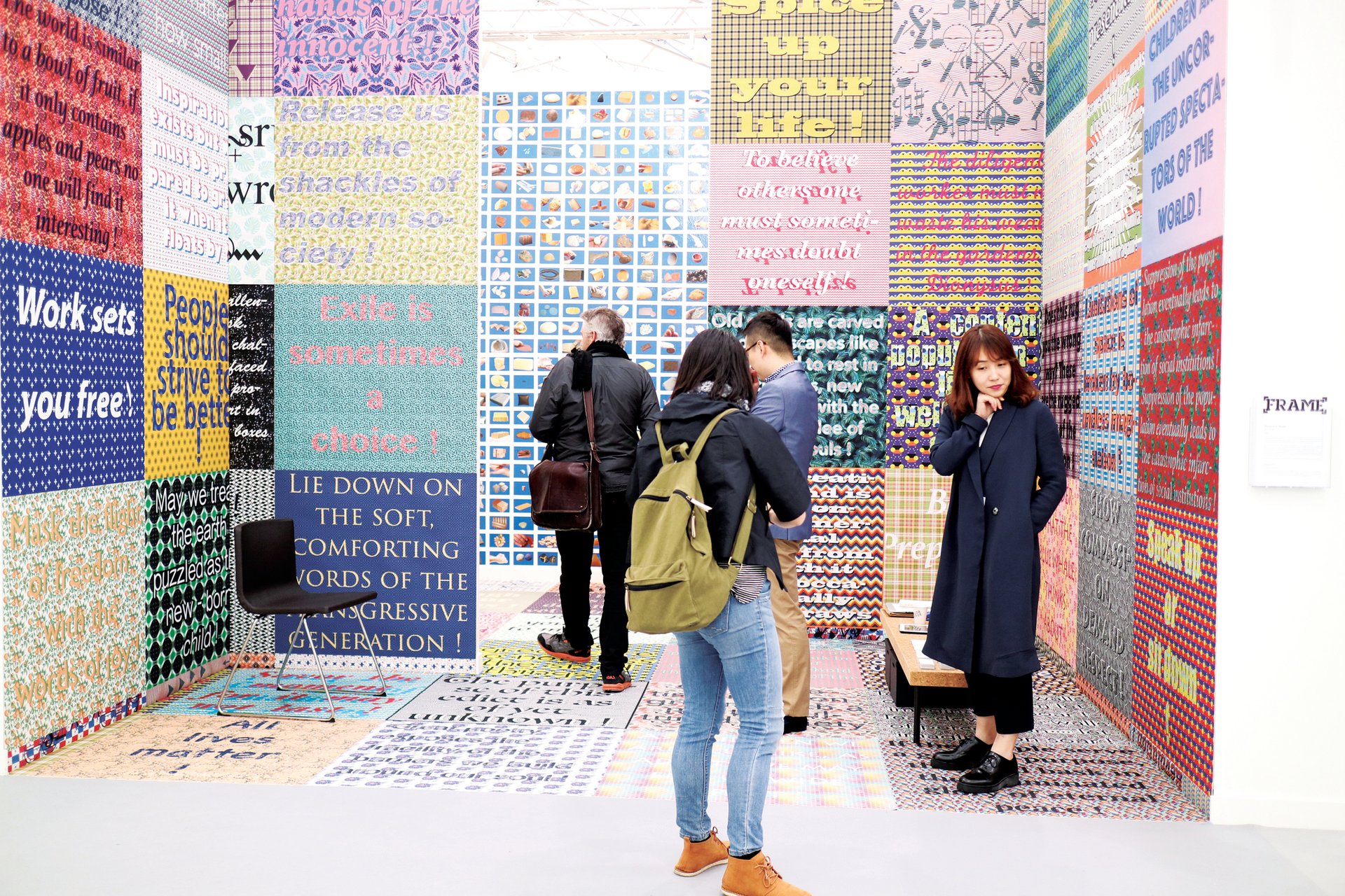 The young Chinese artist Liu Shiyuan studied at New York’s School of Visual Arts and now lives in Copenhagen. Her Shanghai-based gallery has covered its stand with floor-to-ceiling works, including the garish, tactile, customised carpet tiles that form This Way or That Way (2016). They create a visual flood of appropriated slogans from a variety of sources; some were originally political, others commercial. Beyond this installation is As Simple as Clay (2013), a grid of images culled from an internet search for the word “clay”, including stock shots of butter, soap, cheese and even chocolate. “There is no white space in a Leo Xu booth,” Schöneich says.