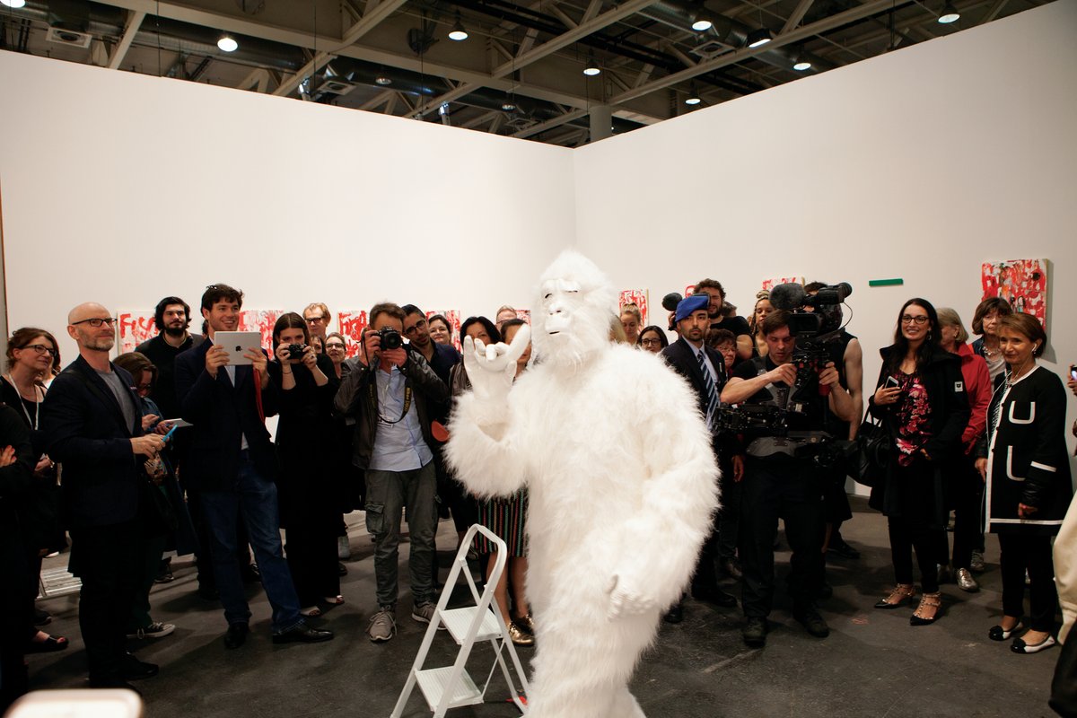Pope.L is in the building New York’s Mitchell-Innes & Nash gallery kicked off Art Basel’s Unlimited section last night with a new performance by Pope.L, the US artist who tackles issues of race and angst across a variety of media. When asked about the reactions he expected from the crowd, he said: “Thoughtfulness,” adding: “I suppose people throwing things might be okay. I can defend myself. I’m not a beast without a mission.” Pope.L debuted The Problem (2016) by throwing white plantains from the window of a white limousine on the Messeplatz before emerging, holding a white umbrella and wearing a white gorilla costume. He then dashed inside, swiftly followed by photographers and videographers. “I’ve committed to just chasing after him like an idiot at this point,” said someone who works at the gallery. “Finally, a good piece of performance art,” said a critic, mid-sprint, whom we’d seen earlier at a different performance. The gorilla stopped at other popular stands before arriving at Mitchell-Innes & Nash’s stand, where he peeked behind some of his paintings. There, before a crowd of art-world heavyweights who’d clearly been told to be there for the climax, he found stacks of €100 bills. He gathered them up and sprinted back to the limo, squeezing himself, at the entrance, past the dealer Jeffrey Deitch, who showed no reaction to any of this whatsoever.