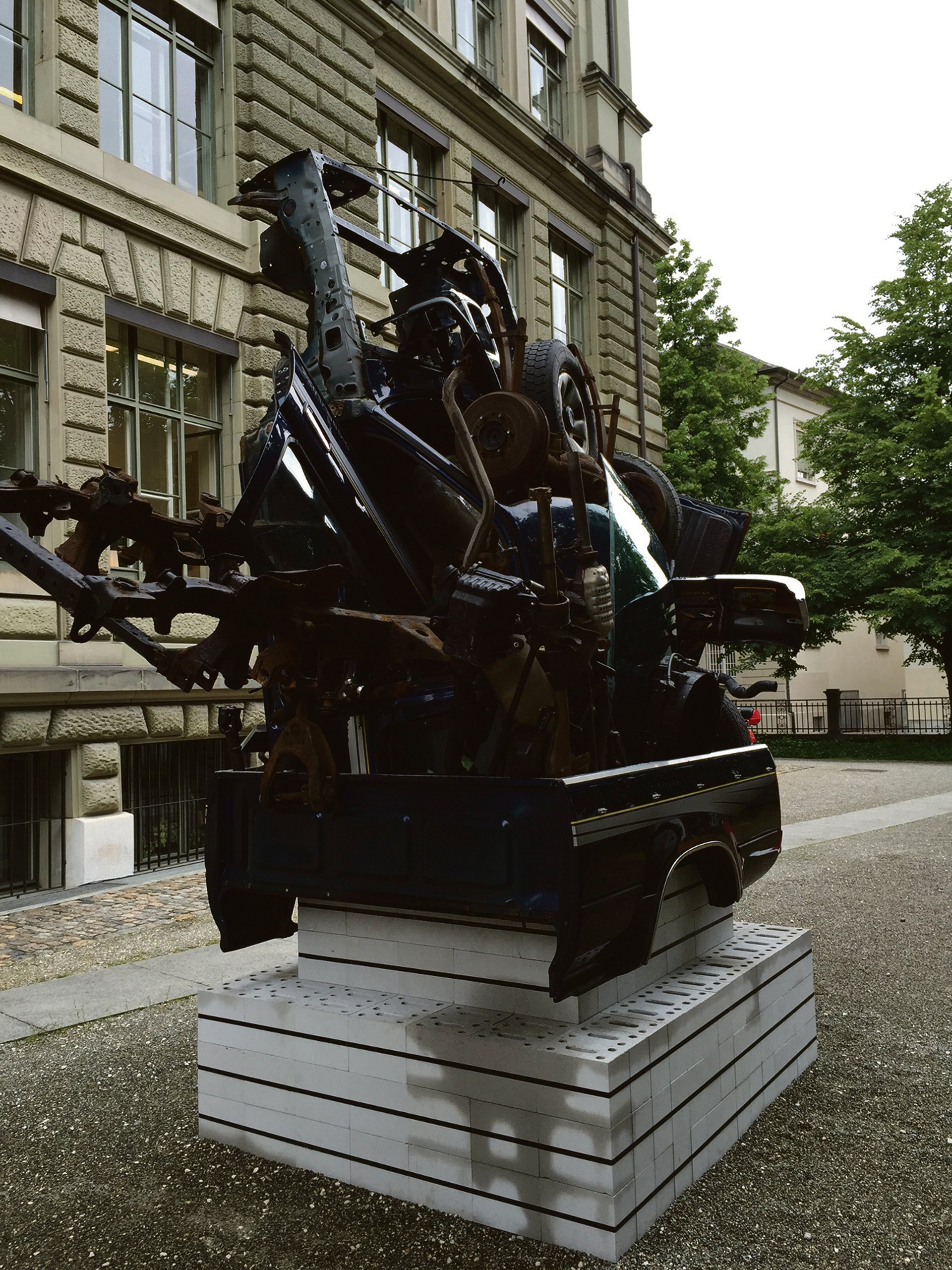 How to deconstruct a pick-up truck One of the strongest works in Art Basel’s Parcours section, which opened last night in the area around the Münsterplatz, is Virginia Overton’s Untitled (Hi Lux) (2016). The artist has deconstructed a Toyota Hi Lux pick-up truck in the courtyard of the local verkehrsdepartement (traffic department) to emphasise the plinth-like nature of the truck’s bed. “They’re almost like kinetic sculptures when they’re driving around,” she says. In 2012, Overton filled the back of her own Toyota pick-up with mortared bricks for a work staged near New York’s High Line park. The artist chose the space for the Basel project partly because it is supposed to be visible from the former office of the art dealer and museum founder Ernst Beyeler, and she liked the idea of him looking down at it, were he still alive. Overton often works with ideas found in Minimalism, but at first glance, the work resembles a piece by the late US artist John Chamberlain. She first had to find a Toyota Hi Lux in Switzerland and then find a mechanic to chop it up. Over a day, she then stacked the parts inside the truck’s bed, with nothing to secure them, so they balance themselves. “Packing is a certain skill I have, having had a truck for so long,” Overton says.