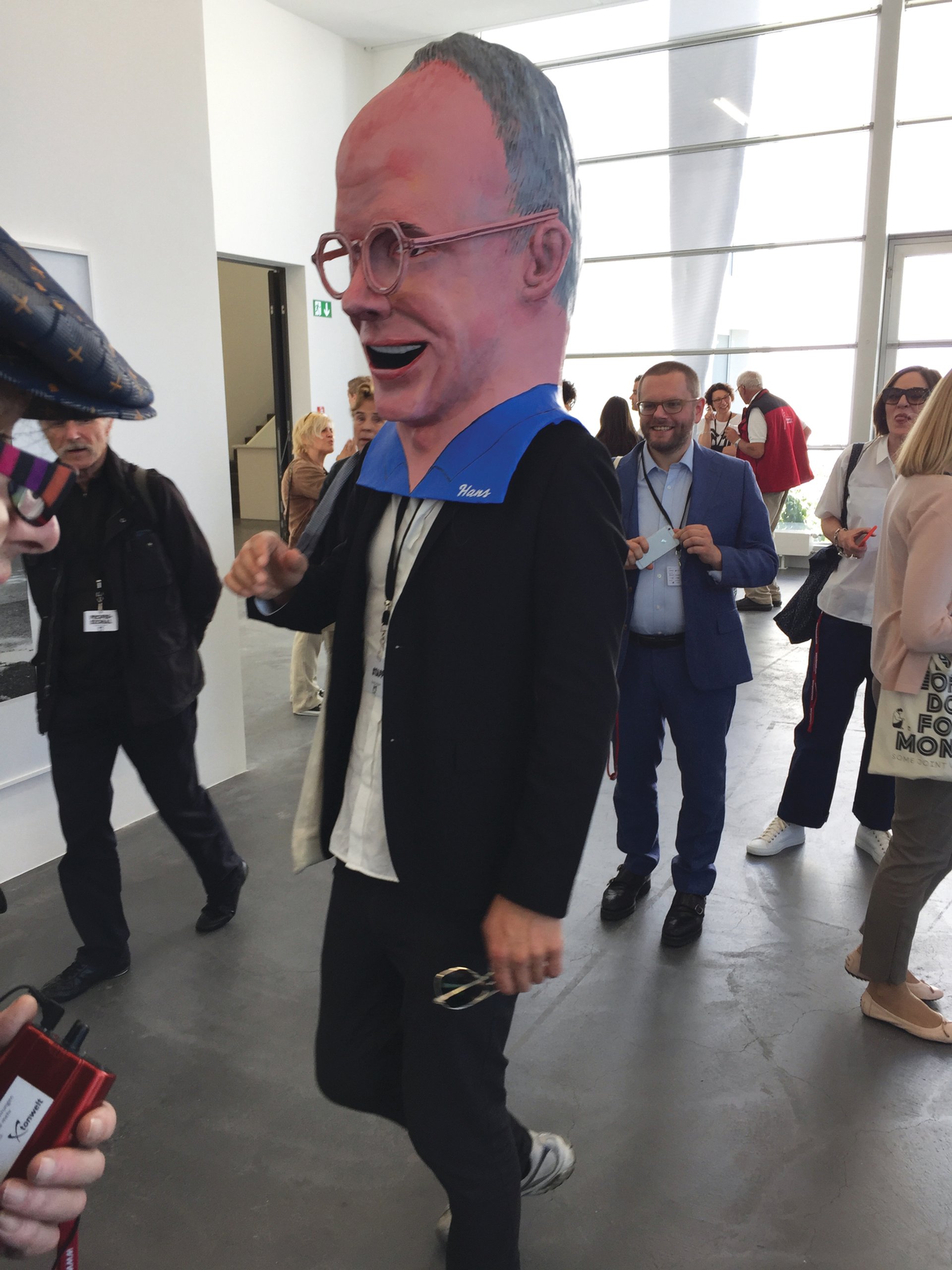 curator of the roving European biennial. The piece he was wearing was made by the art collective aptly known as the Big Head Brigade. Passers-by seemed tickled by the head transplant, and when confronted with a photograph of his lookalike, Obrist exclaimed: “Oh, wow—OMG!”