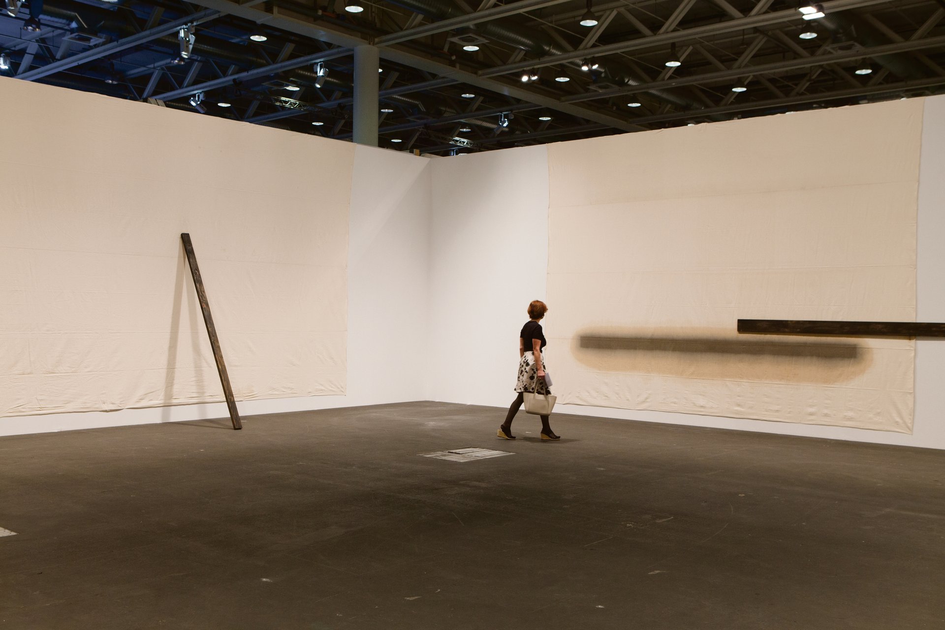 Koji Enokura, Untitled No. 11, 12, 13 and 14 (1978) “[Koji Enokura] is relatively unknown, but I think he’s very important; I’ve always loved his work. This particular piece was created for the Japanese pavilion at the Venice Biennale in 1978. He uses a wooden plank that has been dipped in used oil to produce the images on the four canvases. He omits the frame and just hangs the fabric directly on the wall, showing all the irregularities, the staining and the creases. The leaning wooden panel has a long art-historical tradition. It builds a bridge between the floor and the wall, between three-dimensional and two-dimensional space. This work has more to do with reduction than accumulation. Unlimited is itself an accumulation of works by 88 artists, but this work creates an oasis in which you can almost refresh your mind.”