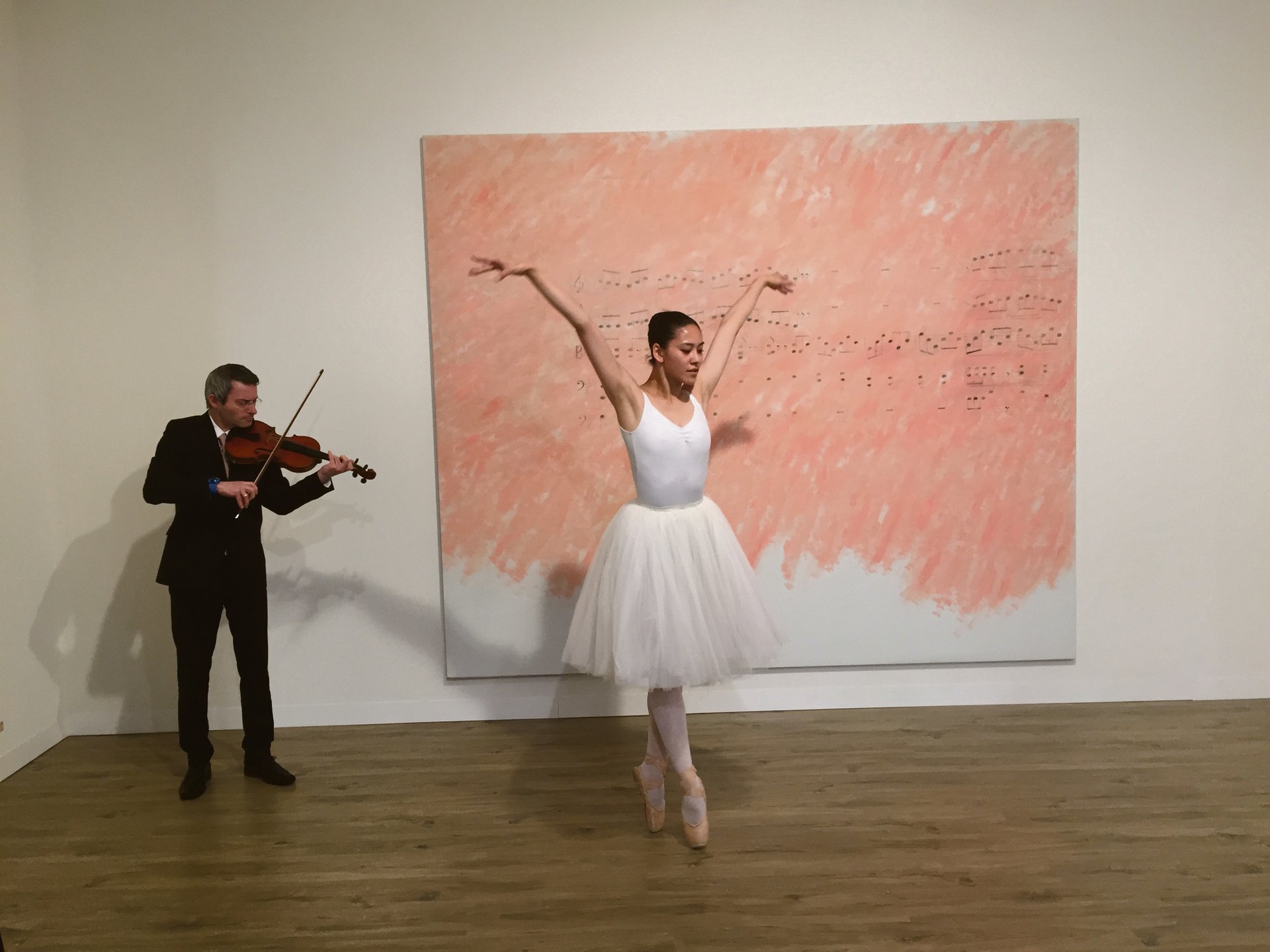 Basel ballet The lilting sound of a violin playing a passage from Stravinsky’s Pulcinella suite is not what you’d normally expect to hear drifting through the ground floor of Art Basel’s Messe. But at regular intervals throughout the fair, Luxembourg & Dayan’s stand is playing host to the Greek artist Jannis Kounellis’s 1972 work Da inventare sul posto (to invent on the spot). For 15 minutes at a time, a violinist repeatedly plays the fragment of the Stravinsky score that is written across a pink-painted canvas hanging on the wall, while a ballerina dances her own multiple improvised interpretations of the music. One of art history’s most elegant live works, it is a calming and civilising respite from the surrounding cacophony.