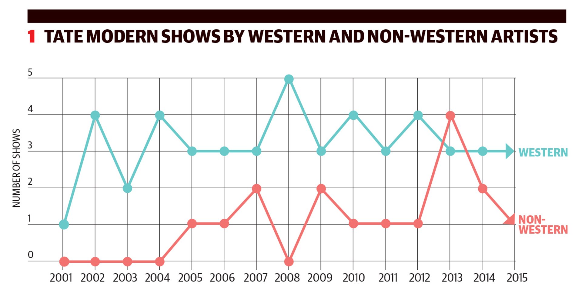 The Tate is keen to celebrate the fact that its programme for the newly expanded Tate Modern marks a major shift in its display strategies, including more geographical diversity, more female artists and a greater emphasis on the contemporary. We analysed major solo exhibitions at Tate Modern, from its first show in 2001 to 2015, to see how it was getting on so far, as well as looking at its visitor attendance compared with other national galleries and museums.