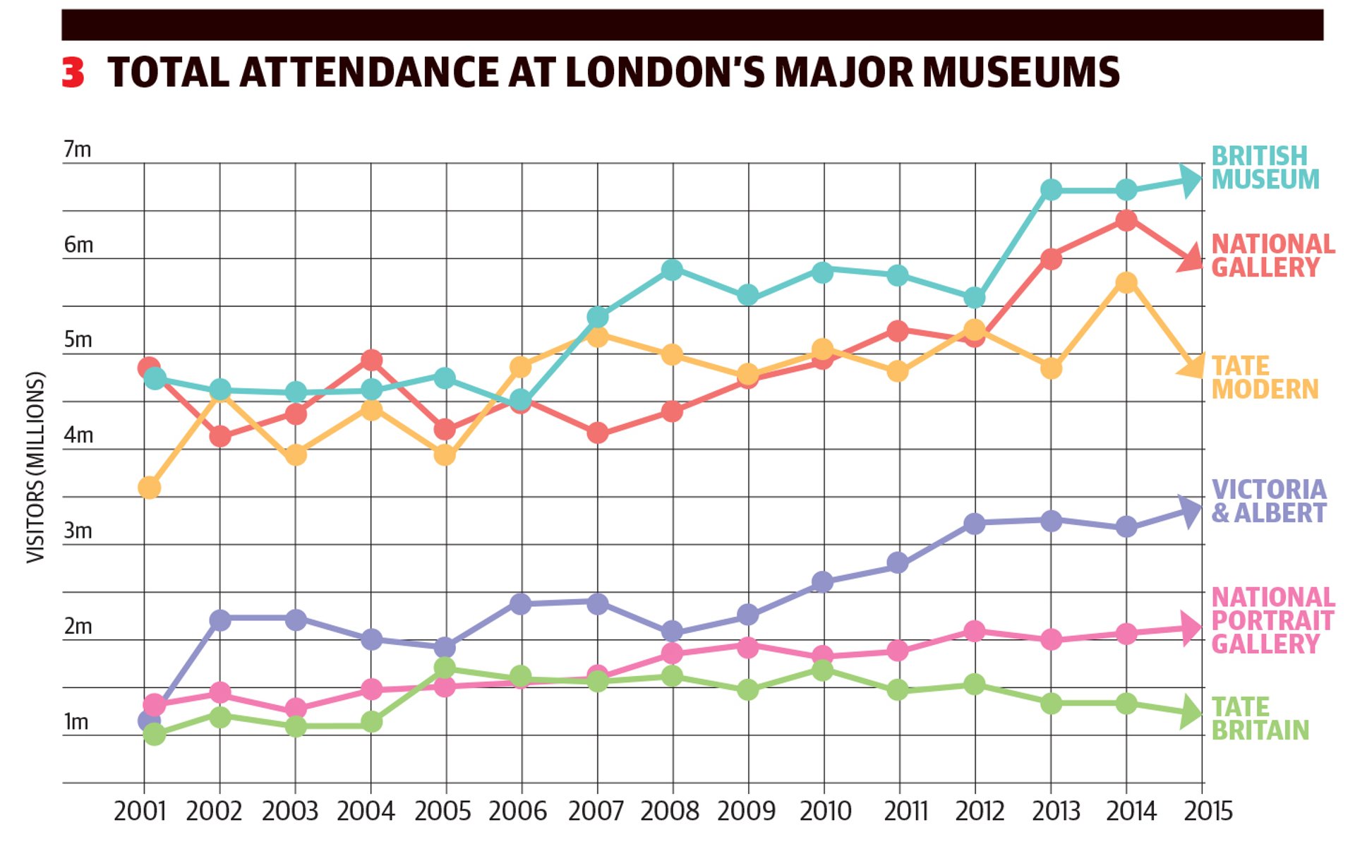 Since 2001—Tate Modern’s first full year and also the year that free museum entry was introduced across the UK—there has been a steady rise in attendance at the five most popular national art museums. Tate Modern was the most popular museum in London in 2006 and hit an all-time high of 5.8 million visitors in 2014. Tate Britain has seen a much smaller rise in numbers, from 1.01 million in 2001 to a peak of 1.6 million in 2010.