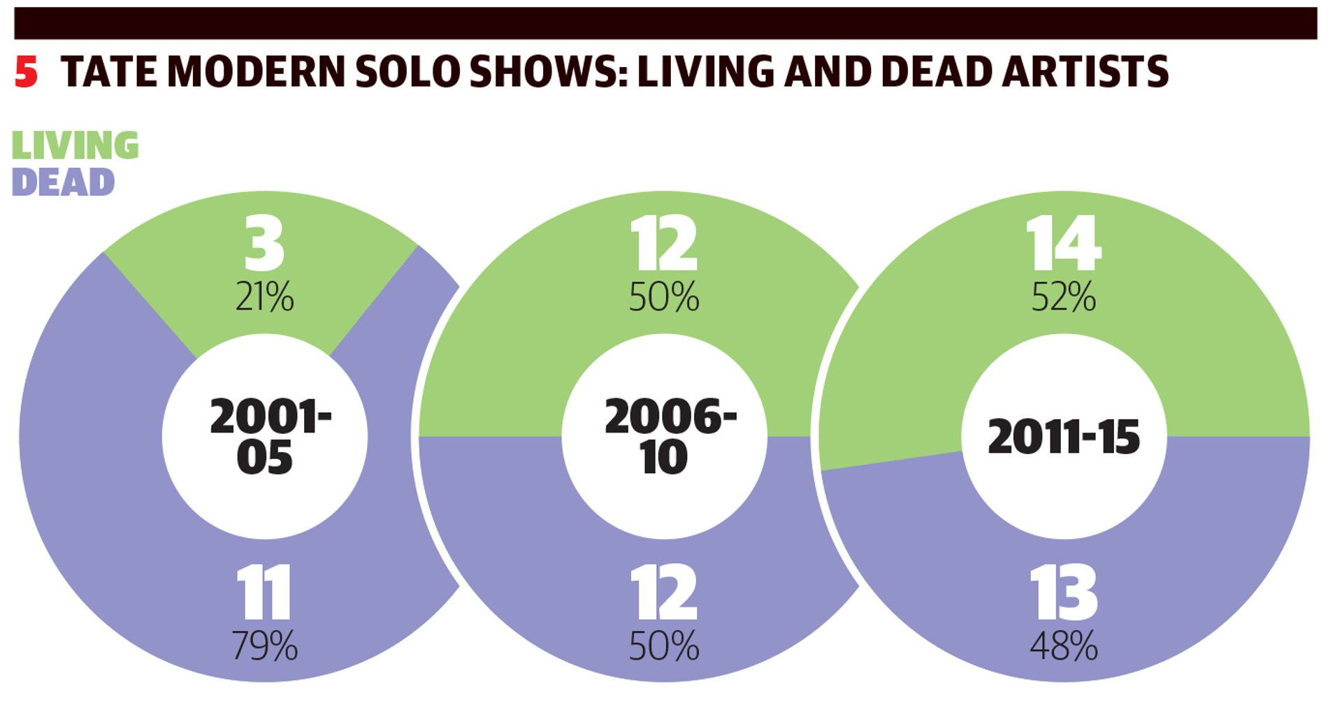 The change from showing mostly dead to a majority of living artists in the past half-decade reflects Tate Modern’s growing emphasis on contemporary art. The public, it seems, still favour Modern over new art: the three most popular shows in the same period were of dead Western men—Gauguin, Lichtenstein and Matisse.