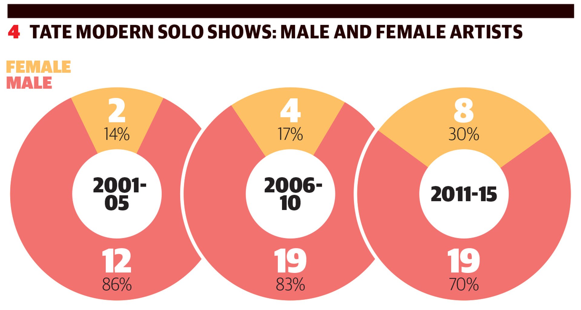 Although the percentage of female artists shown has doubled between Tate Modern’s first half-decade and the last, the percentage is still a paltry 30%. However, in 2015, three of the four paying solo shows were by female artists.