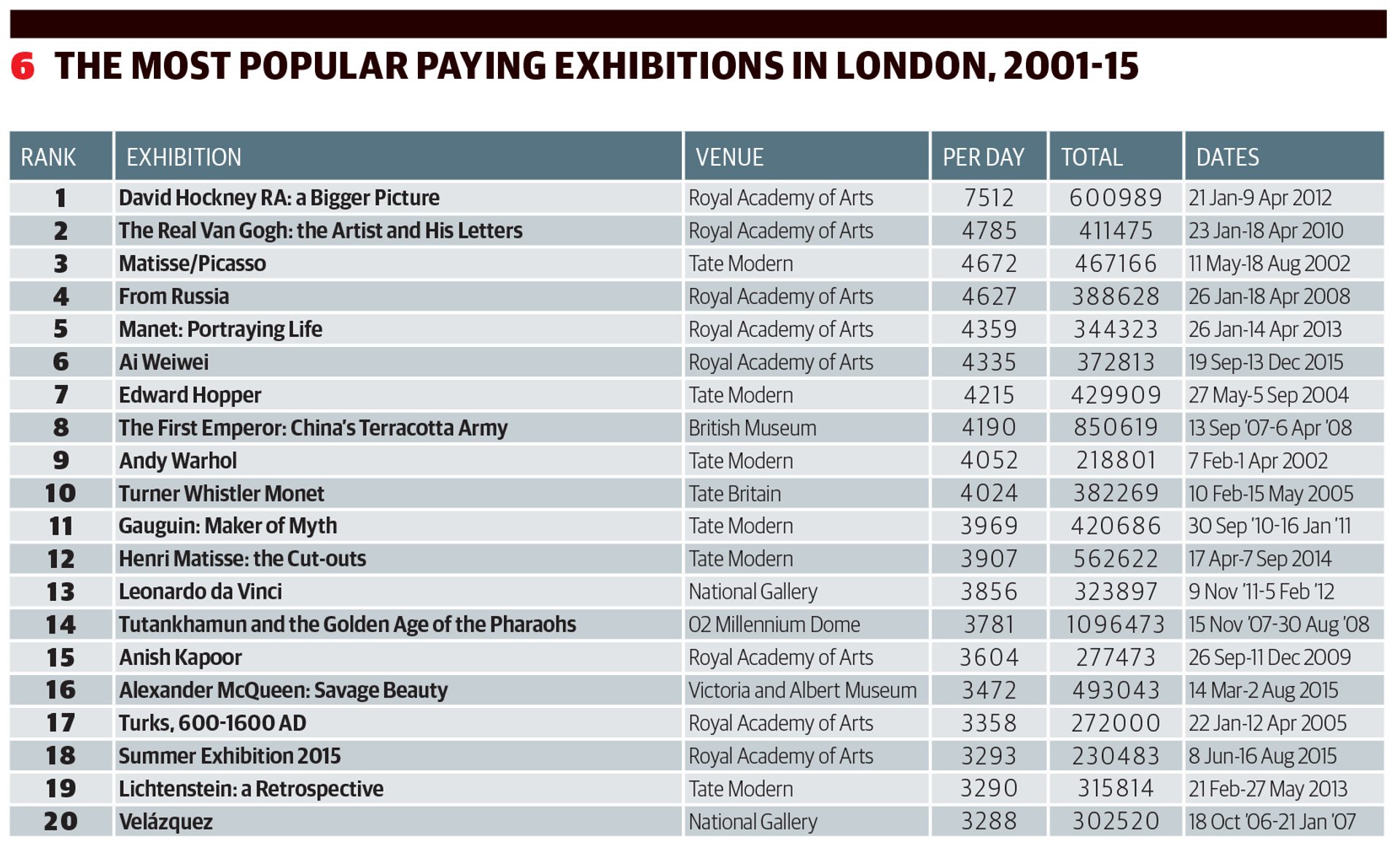 Three Tate Modern shows break into a top ten dominated by the Royal Academy of Arts, which does not receive public funding and does not have a substantial permanent collection, instead relying on temporary exhibitions for footfall (and funding). Tate Britain has only one show in the top 20: Turner Whistler Monet from 2005.