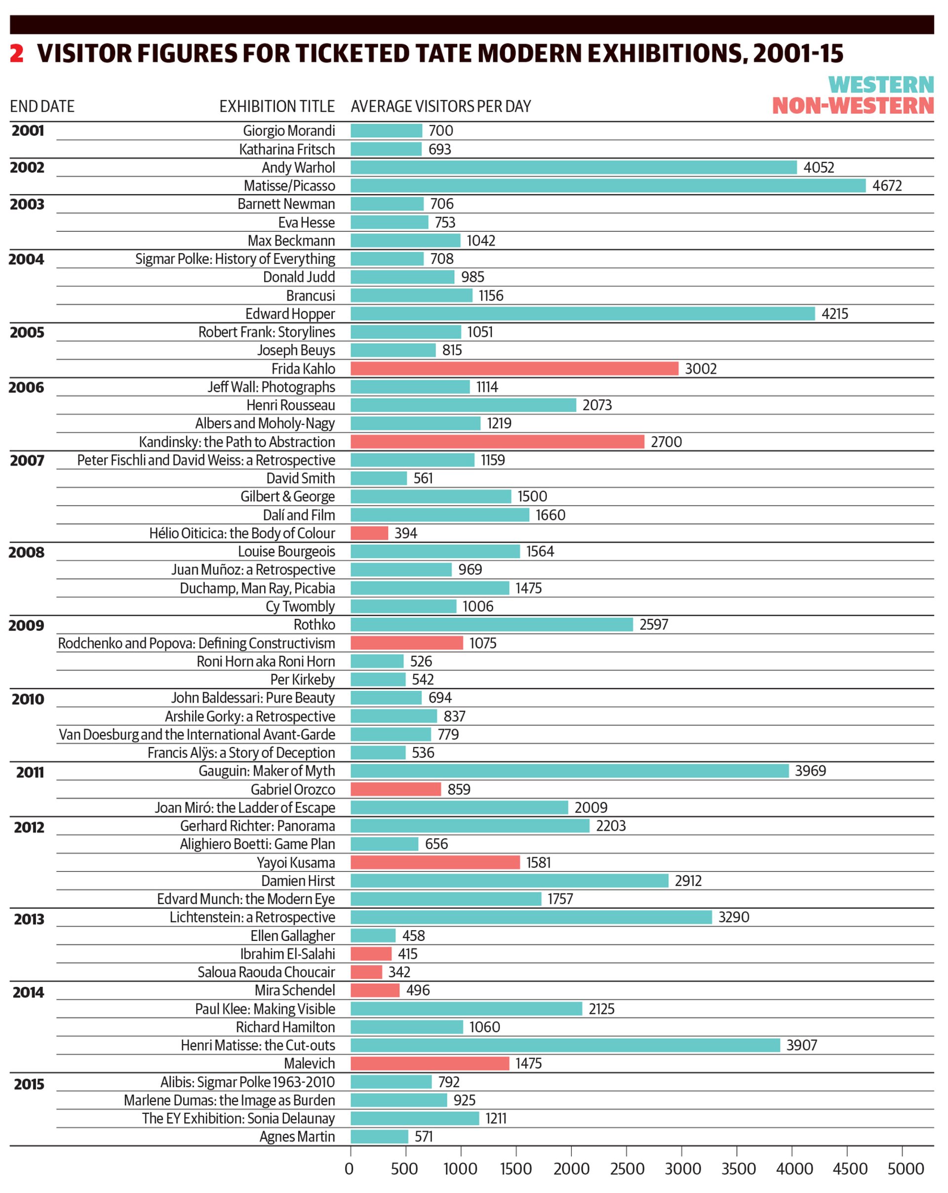 Frida Kahlo and Wassily Kandinsky—who is arguably a Western artist, as he lived for much of his life in Europe and became a French citizen in his later years—are the only non-Western artists to surpass the 2000 visitors-per-day mark. This list does not include the Turbine Hall commissions, which are free. It proves that the Tate has work to do in growing its audiences for a more global perspective on Modern art: the four lowest attendances are for shows by non-Western artists. Click here to see the full chart.
