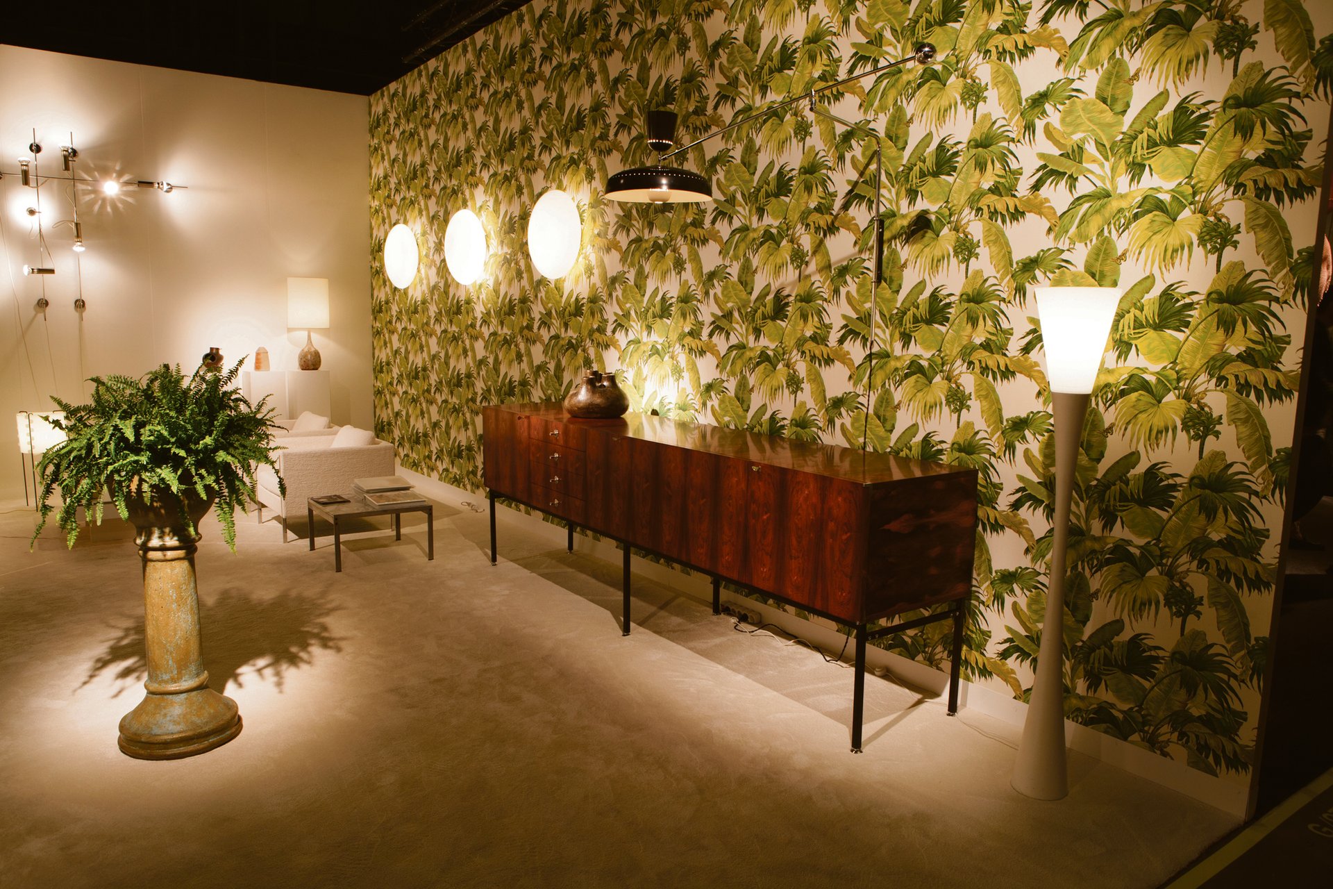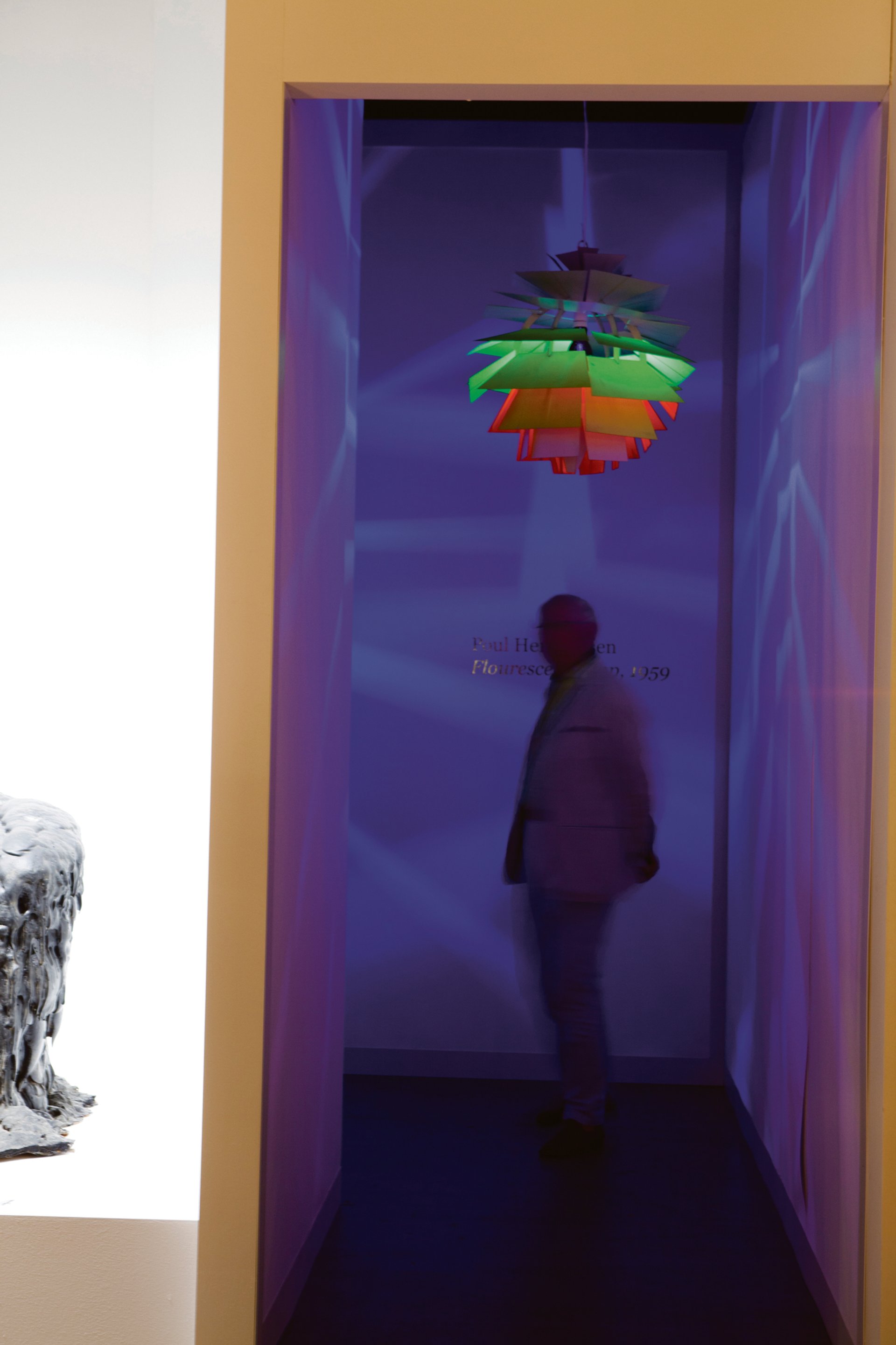 Poul Henningsen, fluorescent lamp (1959) The late Danish lighting designer Poul Henningsen created 15 experimental fluorescent lamps for The House of Tomorrow, a 1959 exhibition in Copenhagen of a futuristic home. Never intended for mass production, the lamp was based on his layered, light-diffusing Artichoke pendant from the previous year. The undersides of its aluminium “leaves” were painted in white, yellow and red shades that glow blue, green and orange when lit by an ultraviolet bulb. The Danish design gallery Dansk Møbelkunst is showing a pair of the lamps to best psychedelic effect in its darkened, photopaper-lined booth, as part of the Design Curio programme.Two of fifteen examples; €120,000 each