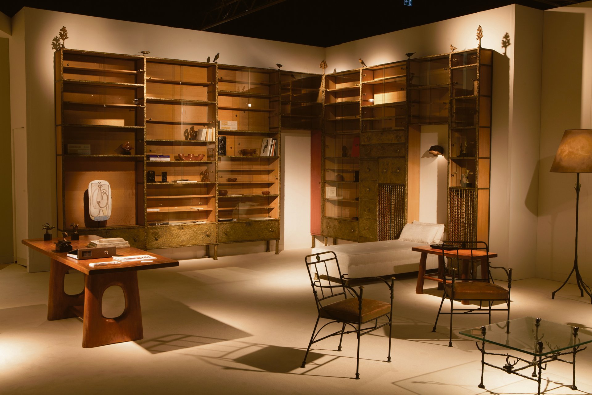 Diego Giacometti, Chambre à livres (bedroom of books, 1967-69) The Parisian dealer Jacques Lacoste has transformed his stand into the elegant Ile St-Louis apartment of Marc Barbezat, the first publisher of the existentialists, including Jean Genet and Jean-Paul Sartre. Almost a decade after printing Genet’s essay about Alberto Giacometti’s Montparnasse studio, Barbezat commissioned a suite of furniture from the Swiss sculptor’s younger brother, Diego. This gold-patina bronze corner library was designed to display the publisher’s personal collection of books and manuscripts in his bedroom. Giacometti, who often worked with natural motifs inspired by the Alpine landscape of his childhood, topped each leg with a bird or miniature tree.Unique item; €2.5m • Galerie Jacques Lacoste, Paris