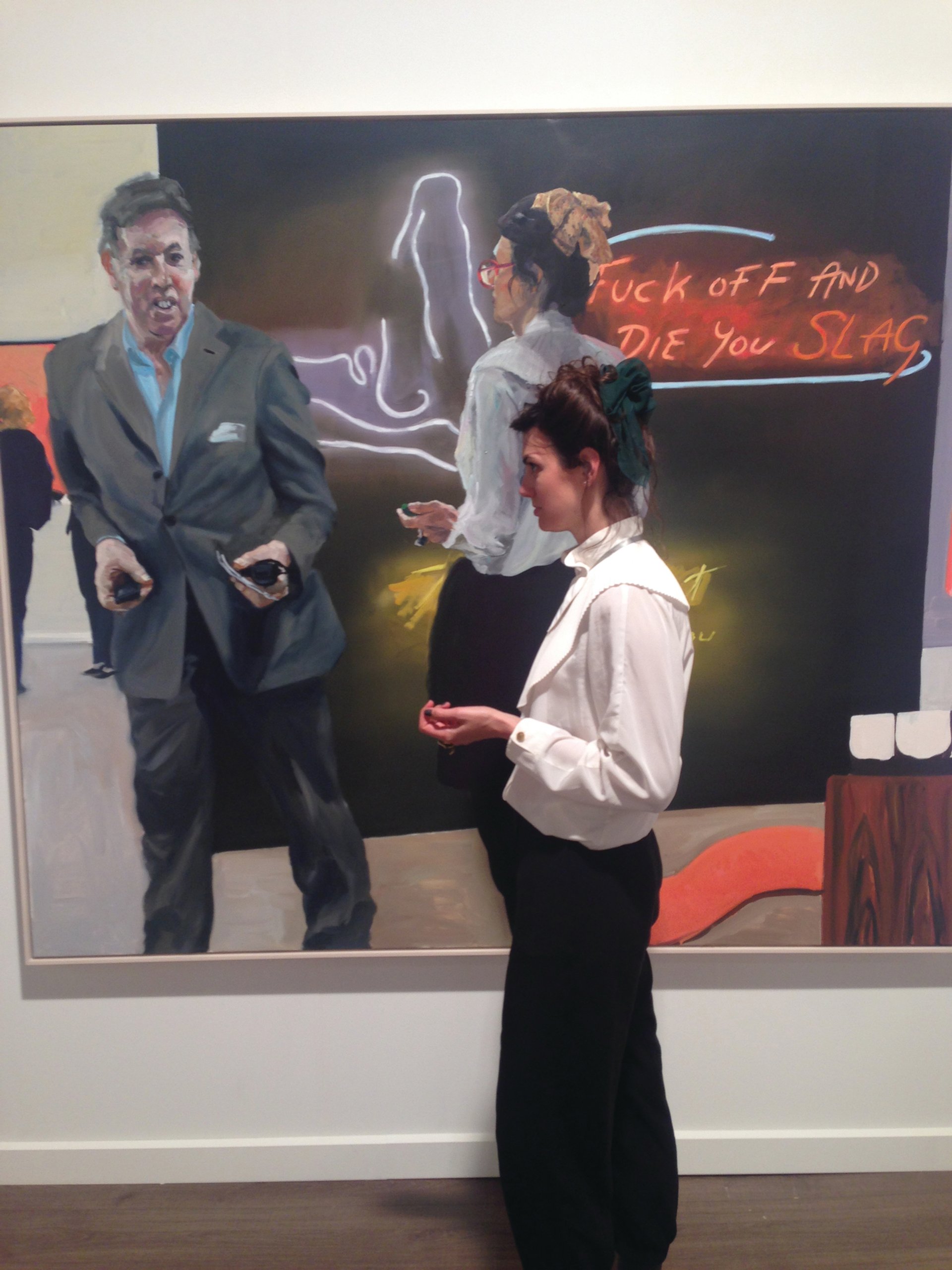 Life imitates art imitates life Nobody was more surprised than Vanja Smiljanic when she opened the Wednesday edition of The Art Newspaper’s daily coverage of Art Basel. The staffer at the Brussels-based gallery Waldburger Wouters thought that the woman depicted in Eric Fischl’s work The Wall, on sale at the stand of New York’s Skarstedt gallery, looked familiar (that hair, that blouse). It then dawned on Smiljanic that she was the figure depicted in Fischl’s art-world pic splashed across our front page. “I thought I was hallucinating! I think it was at Art Brussels,” she says, going so far as to take a selfie in front of the painting wearing the same clothes, doing the artiest double-take at the fair.