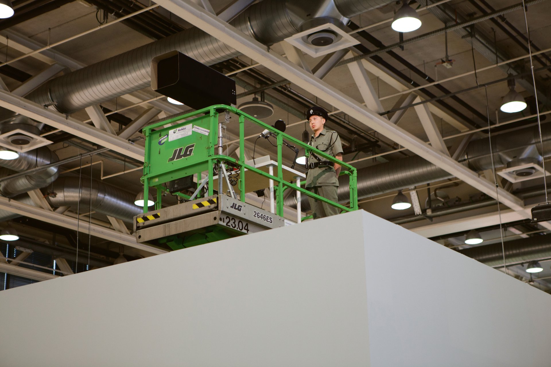 Samson Young, Canon (2015) The Hong Kong-based artist Samson Young has created a work that commands visitors to look up and listen in the Unlimited section of the fair. “It fits in with his works in sound and media and his interest in political frontiers. He’s referencing the border between South and North Korea, where a kind of Cold War is being waged with loudspeakers. The man on the cherry picker is imitating bird song—possibly a reference to Paul Klee’s Twittering Machine.”• Galerie Gisela Capitain, Cologne; Team, New York