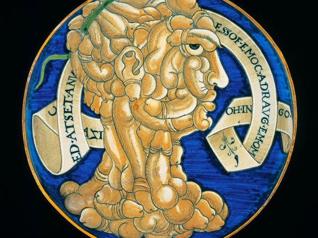The piece with the clearest link to Goethe’s poetic imagination must be no. 26, showing the triumph of the sea nymph Galatea. She stands on a shell, surrounded by amoretti, dolphins and a couple of ardent lovers on a raft. At the climax of the Classical Walpurgis Night in Faust, Part II, Galatea appears riding on a shell-chariot, attended by dolphins and symbolising the primal life-giving power of the sea. The maiolica paintings are certainly light-hearted—and all the more delightful for it—but it would not be surprising if one of them helped to inspired what Goethe called the “very serious jokes” of Faust II.