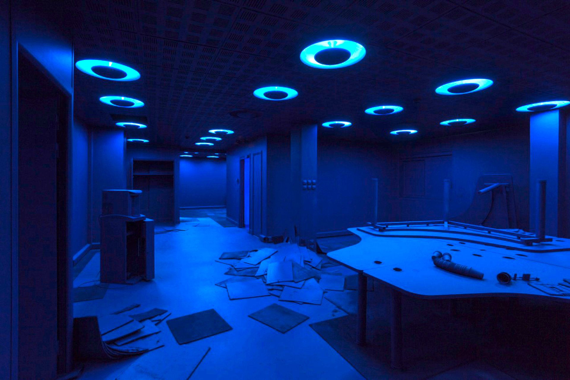 Every single wall and surface of the abandoned building, which still contains some furniture and discarded items belonging to former employees, had to be primed before being painted and glazed, in order to achieve a uniform colour, from the underground vaults and IT server rooms— “these floors feel the most disorientating,” Garayeva-Maleki says, “as if the blue space is about to close in on the viewer”—to the Baroque staircase and spacious rooms on the upper floors.