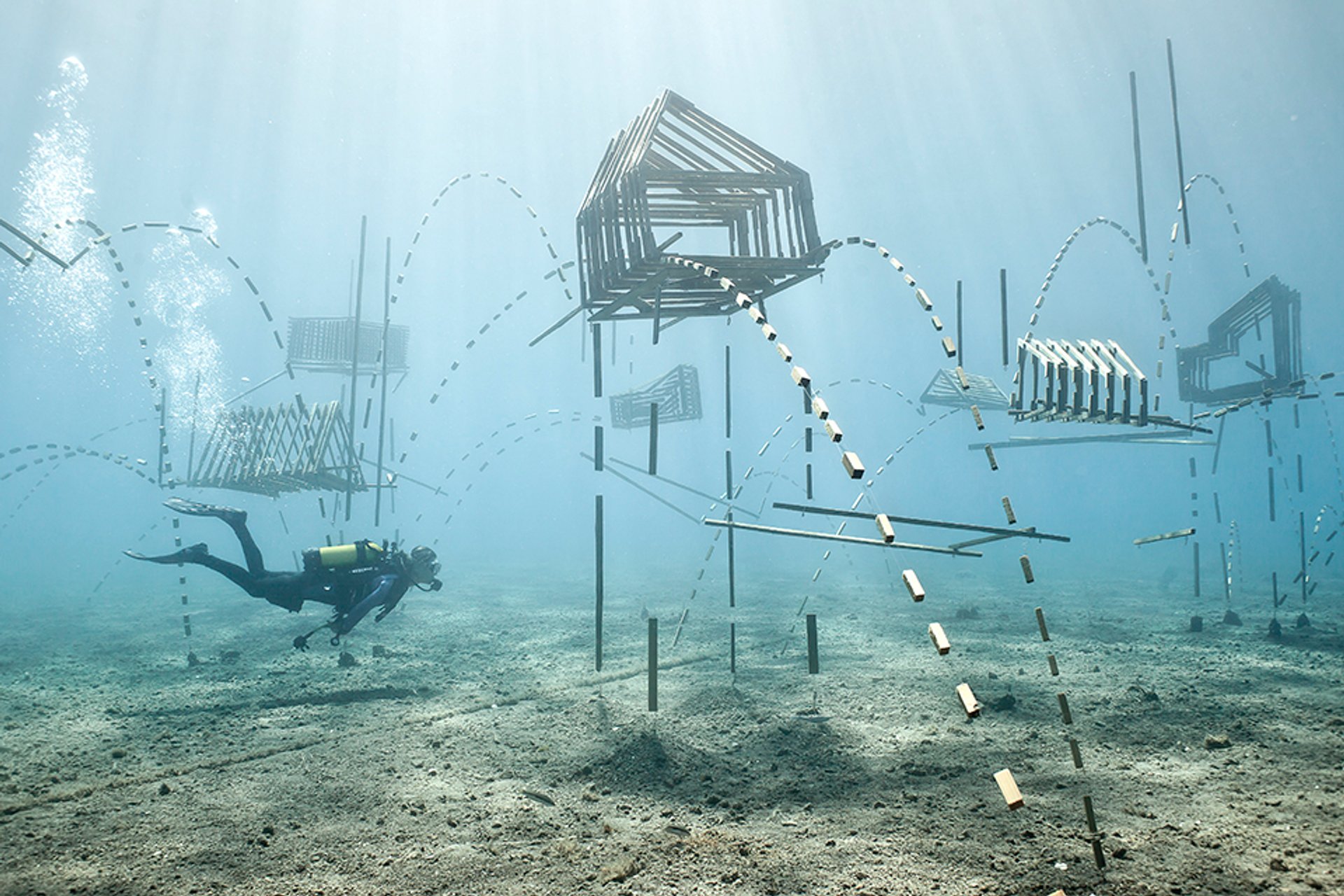 These agile aquatic females provided an appropriate motif for the weekend. Although (most) of the guests did not indulge in more frolicsome antics, the lure of the Aegean always means that pretty much the entire Hydra weekend is spent either in or beside the sea. And this time, there was more watery activity than ever—albeit of a more aesthetic nature—with the independent installation by the enterprising art duo Mathieu Goussin and Hortense Le Calvez (aka forlane 6 studio), of an underwater artwork floating just above the seabed off Vlichos Beach. Apparently representing “a sunken village on stilts fragmenting itself”, the piece also proved highly popular with many of the guests on account of its marker buoy providing a good spot to aim for on their post-prandial swims. Art Ahoy!