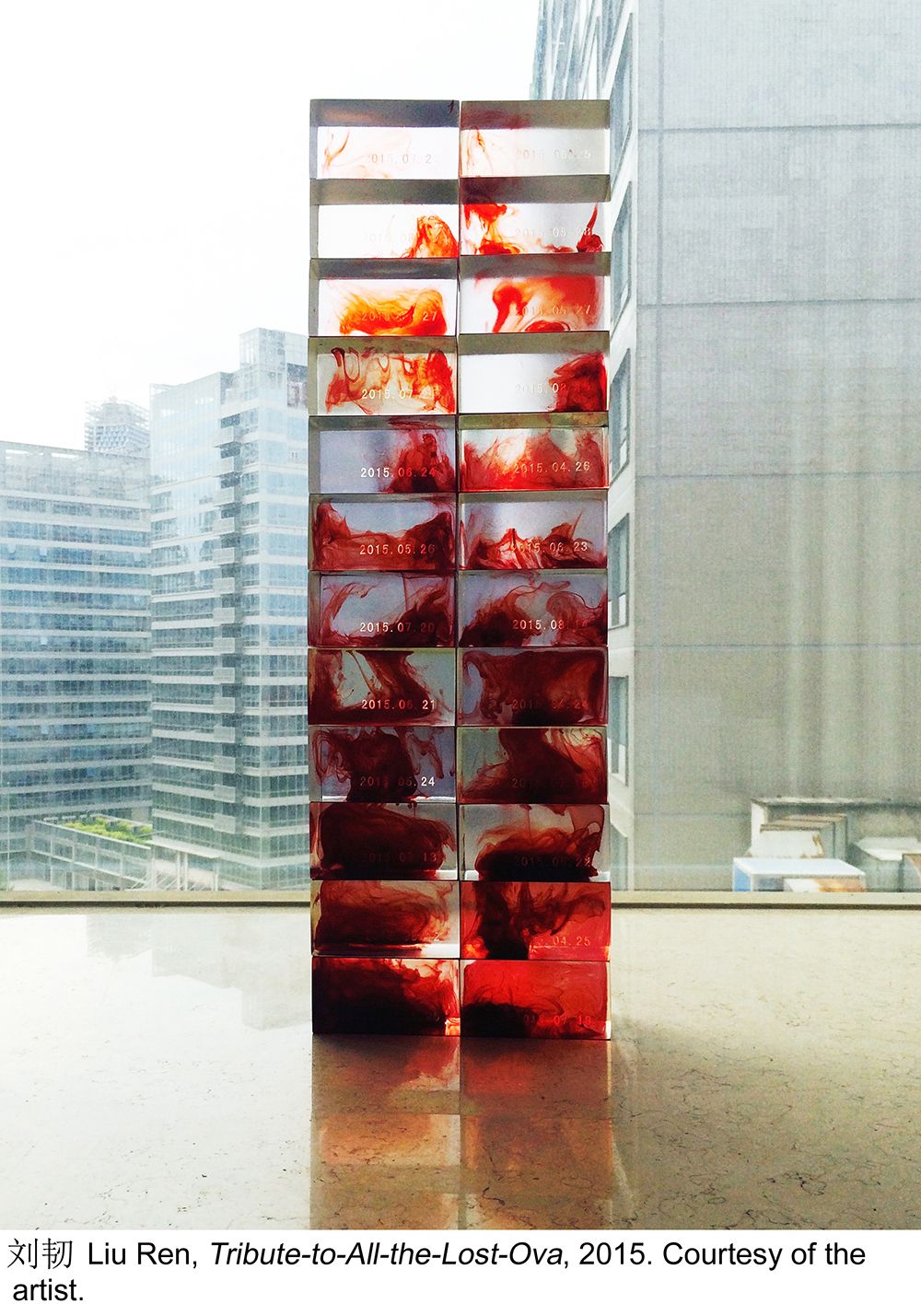 The Eli and Edythe Broad Art Museum at Michigan State University (Broad MSU) will welcome the work of 27 female emerging artists from China—some of whom have never before shown in the United States—in the exhibition Fire Within: a New Generation of Chinese Women Artists, due to open on 27 August (until 12 February 2017). Shifting power structures in the workplace and home, gender identity and changing perceptions of cultural dynamics within China’s traditionally patriarchal society and in the wider world are among the topics explored. The artists represented work in a variety of media: painting, photography, animation, video, performance—and even bodily fluids. In Liu Ren’s sculpture Tribute to All the Lost Ova (2015), stacked clear resin blocks are coloured with menstrual blood, from dark purple-red masses to orangey swirls. “The work represents the continual pressures and challenges that women face throughout their lives,” says the curator Wang Chunchen.