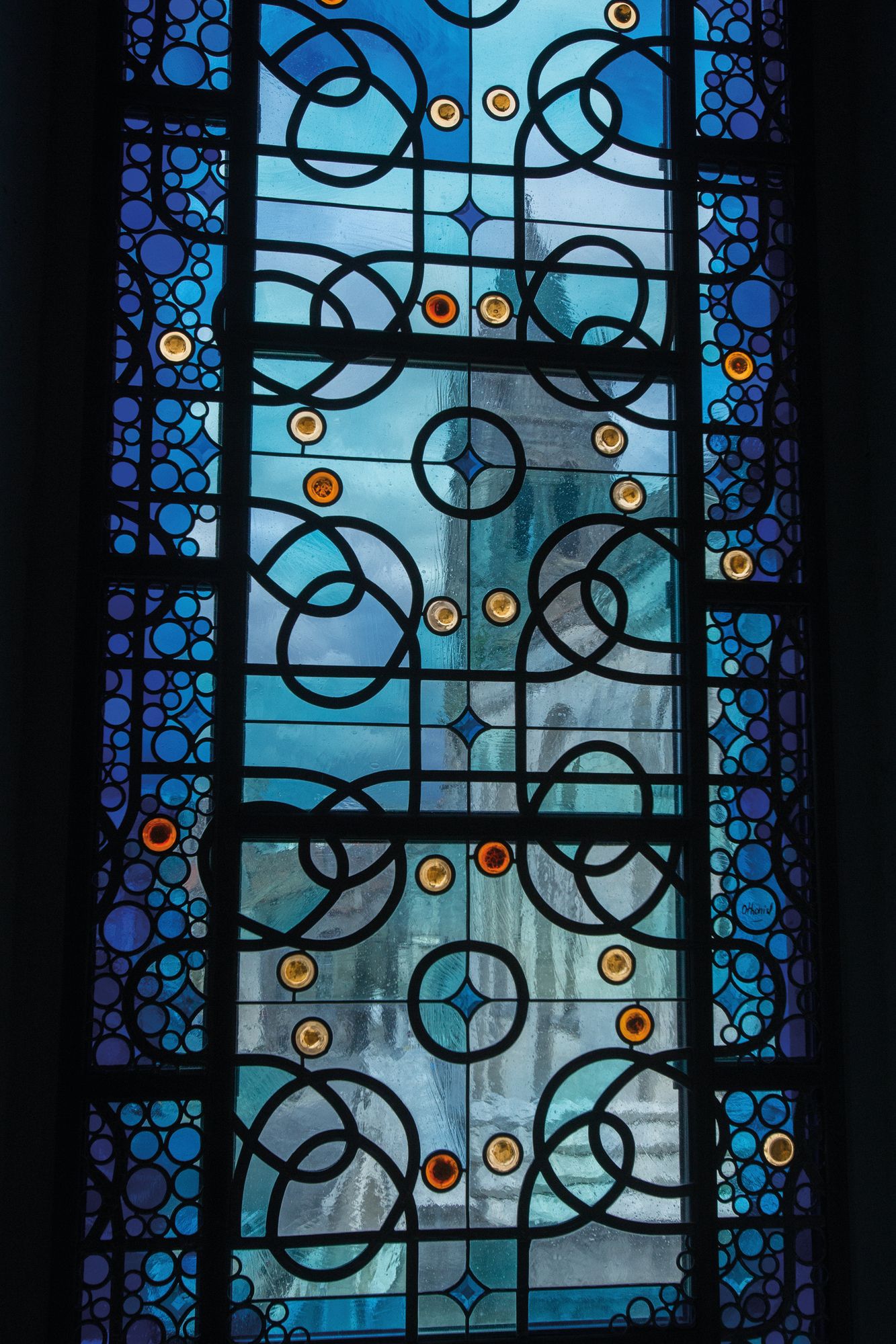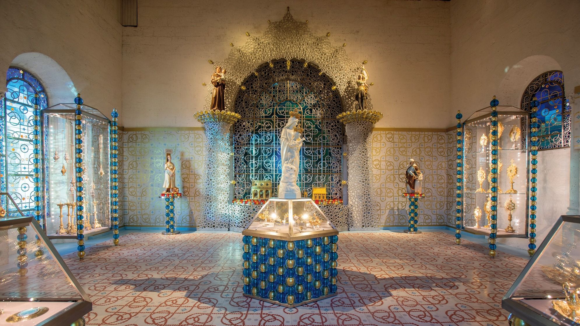 Pure theatre The result, as in his creation for Versailles, is pure theatre. One glass case displays a group of flamboyant golden chalices and pyxes on a Venetian glass bead pedestal; another showcases brilliantly coloured vestments. A great stained-glass window, linking the treasury to the cathedral, is done in graduated shades of blue speckled with gold, overlaid with a braided Roman-knot tracery and set in a latticework of aluminium and a profusion of Venetian glass beads. The gilt-beaded tracery motif is carried through in the rooms’ hand-printed wallpapers and echoed in patterned cement-tiled floors (crafted using techniques developed in Abadie’s time).