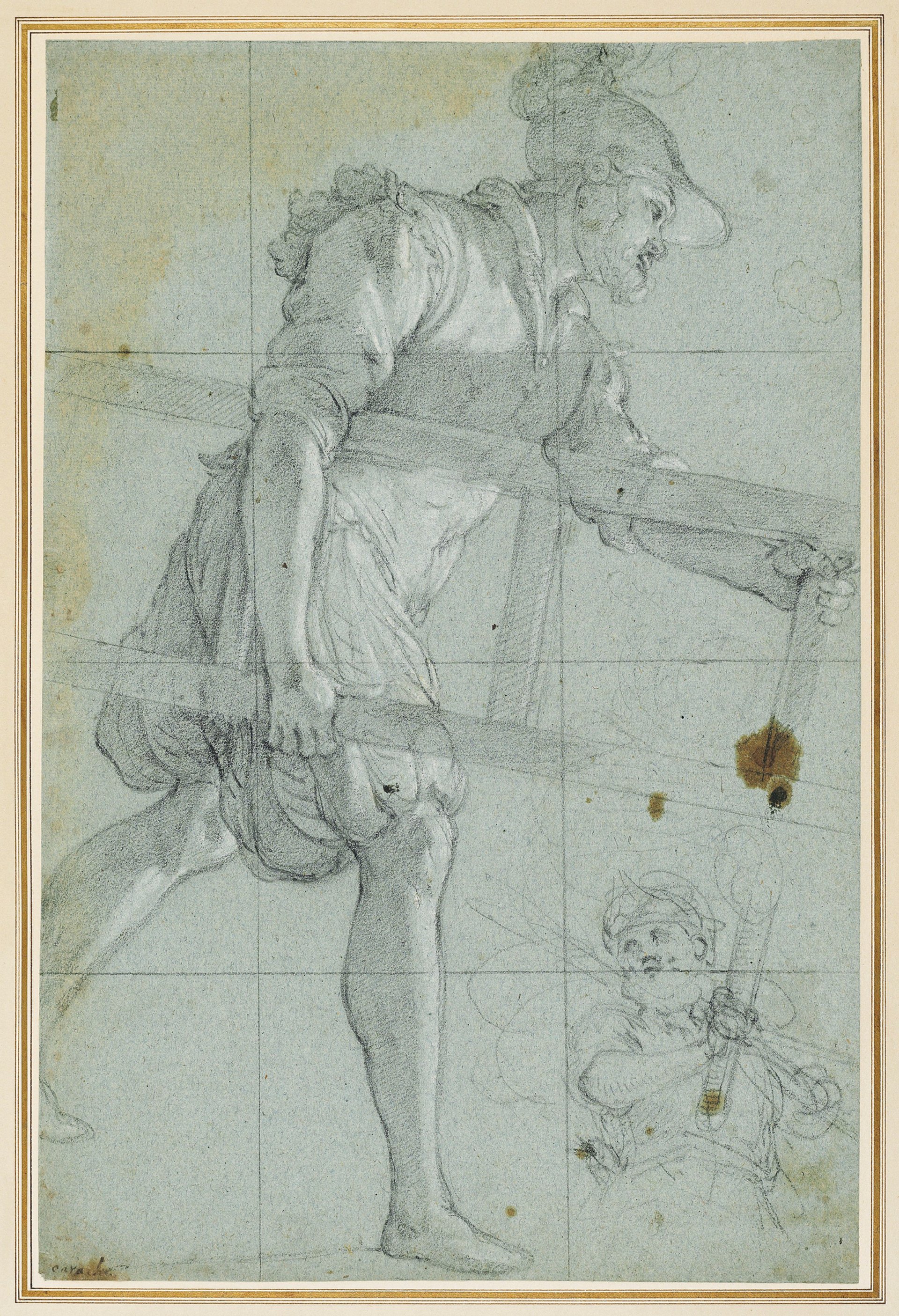 A soldier carrying a ladder, and a subsidiary study of a man holding a torch (recto); faint fragmentary study (verso)