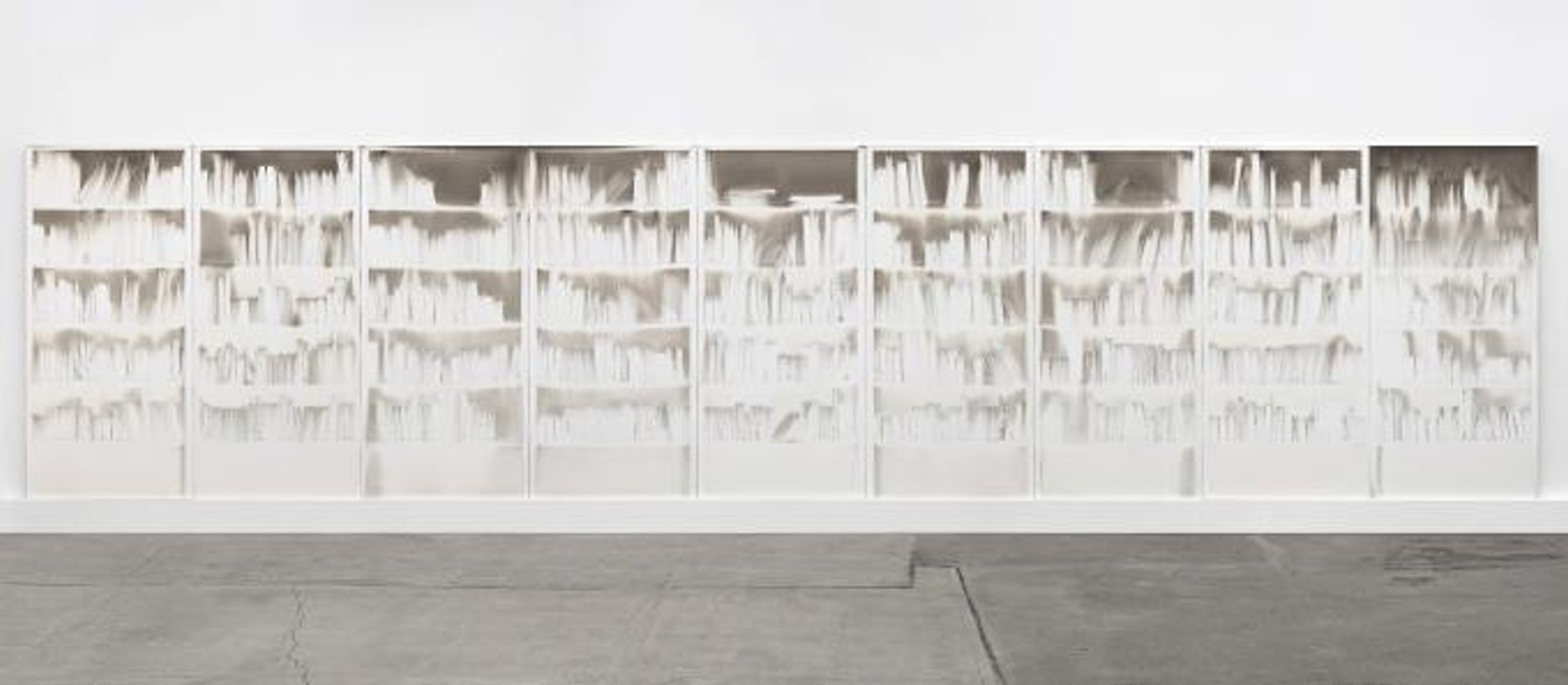 Among the other highlights of the fair is a grand and poetic work by an artist who rarely shows in the US: the Arte Povera artist Claudio Parmiggiani at New York’s Bortolami Gallery. His untitled piece on wood, nearly 8ft high and 34ft wide, is a multi-paneled library created by smoke and soot.