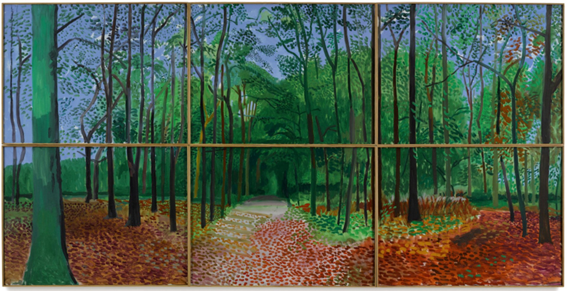 Woldgate Woods, 24, 25 and 26, which was shown in the artist’s 2012 Royal Academy show and is being sold by a private US collector, was painted over a four-day period in 2006 when Hockney was in Yorkshire caring for his elderly mother. The work was painted on six canvases, partly because the staircase at his Bridlington studio was too small to fit a large-scale work down it. “He was also very influenced by photography at that time,” Barker says.