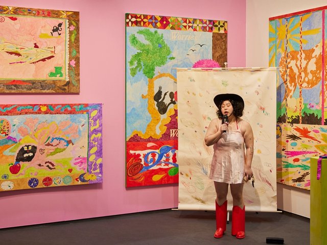 There’s no escape from the art at Frieze this year—not even in the washrooms. For her Frieze Project, Julie Verhoeven has redesigned every aspect of the male and female toilets, from the lids and seats to the lavatory bowls and the insides of the urinals. “The toilets have always been my favourite spot at Frieze; they are a refuge and a place to relax. I wanted to make them womb-like but also a little bit troublesome,” she says. There’s blaring music playing while the artist patrols the (blue-carpeted) Ladies and the (pink-carpeted) Gents, dressed in flamboyant washroom-attendant regalia and “making sure that people put their seats up and wash their hands”. If she leaves her post, a life-sized cut-out of Verhoeven will act as her replacement, and for today’s VIP opening, she is also relying on help from the art collector Valeria Napoleone, who will sport a personalised apron emblazoned with the instructions “Wipe from Front to Back”. Who says patrons don’t support their artists?