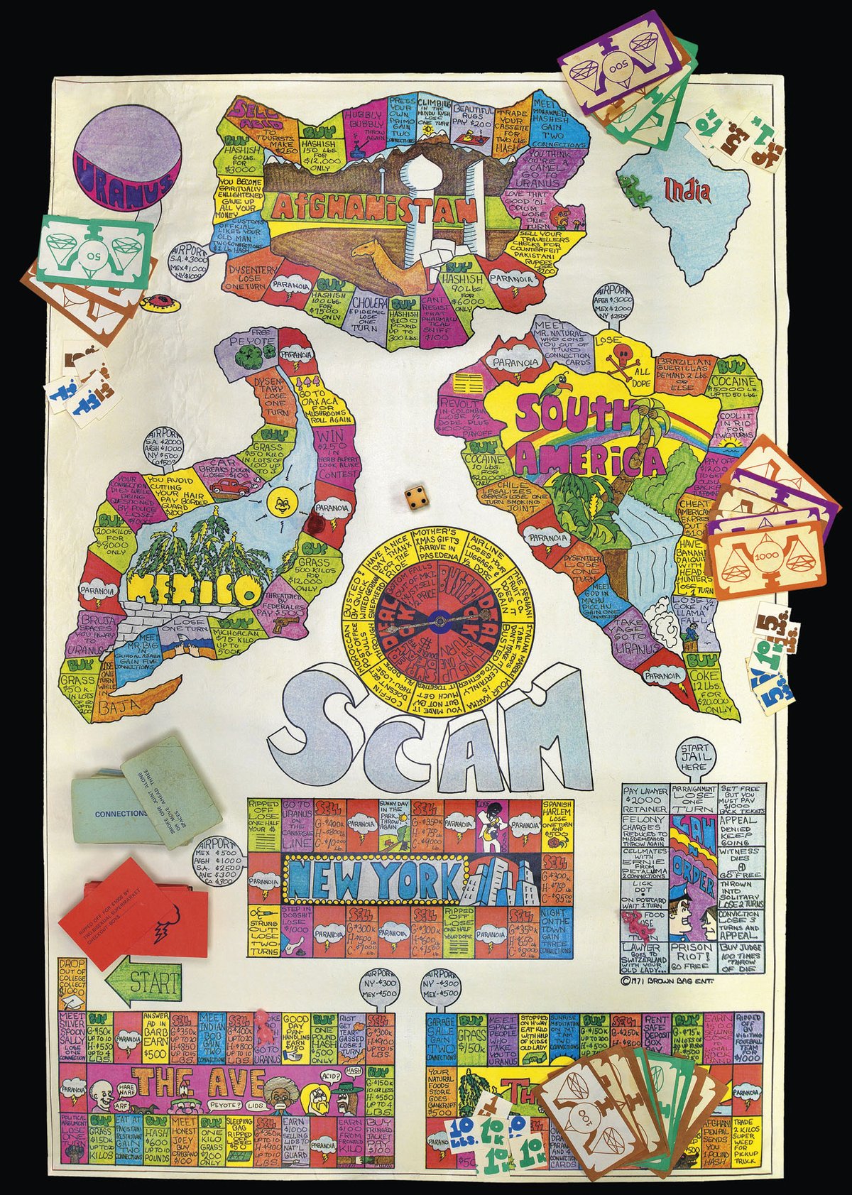 A vintage board game is putting visitors to Frieze Masters on cloud nine. Scam: the Game of International Dope Smuggling, available with Daniel Crouch Rare Books, dates from 1971, the year US president Richard Nixon declared drug abuse to be “public enemy number one”. To win the game, devised by Brown Bag Enterprises, players must make a cool $1m by buying and smuggling dope. Players move around a psychedelic board that features maps of Afghanistan and Mexico, picking up Connection or Paranoia cards along the way (these contain racy instructions such as “smoke one joint alone or move ahead three spaces” and “ripped off for $1,000 by two bisexual supermarket checkout boys”). Different coloured tokens represent pot (green), hashish (brown) and cocaine (blue). But whoever buys the game, priced at £10,000, needn’t worry too much about the minutiae. According to the instructions, “if any of the following rules seem vague, unclear or stupid, feel free to change them to suit yourself”. Finally, a game where everybody wins.