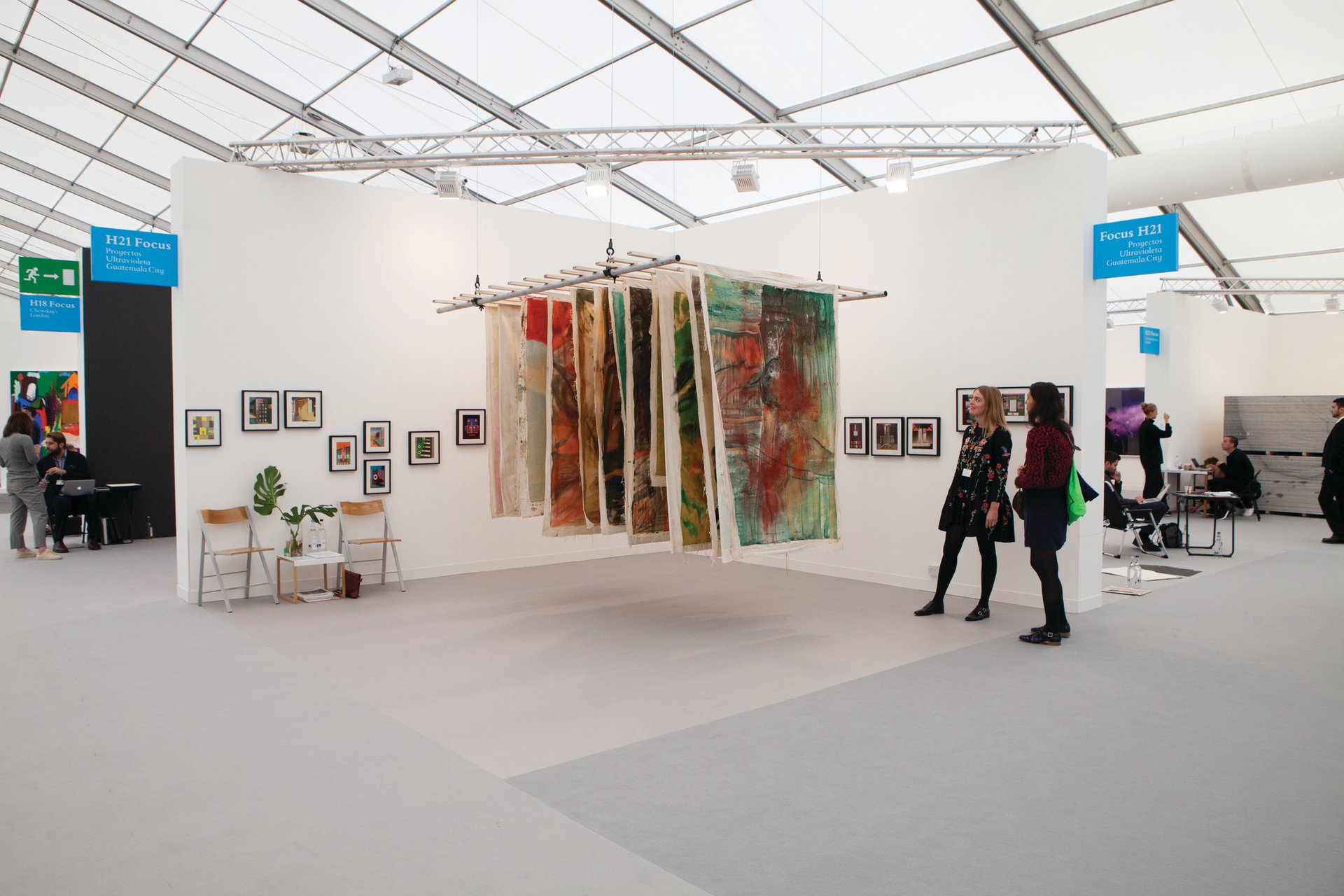 Wild, born in 1922, left Switzerland with her family in the 1930s, fleeing the Nazis for Buenos Aires. Suter, her daughter, was born there, and although they later returned to Switzerland, both now live on Lake Atitlán in Guatemala. Their art differs greatly but intrigues in equal measure. Wild’s small but elegant collages, made from consumer magazines, evoke Constructivist and Bauhaus paintings and designs. Suter’s canvases are more expressive and elemental, containing twigs, feathers and other organic materials picked up when they are left outside after completion. They hang from a rack and can be touched and walked through: a rare tactile moment at the fair.