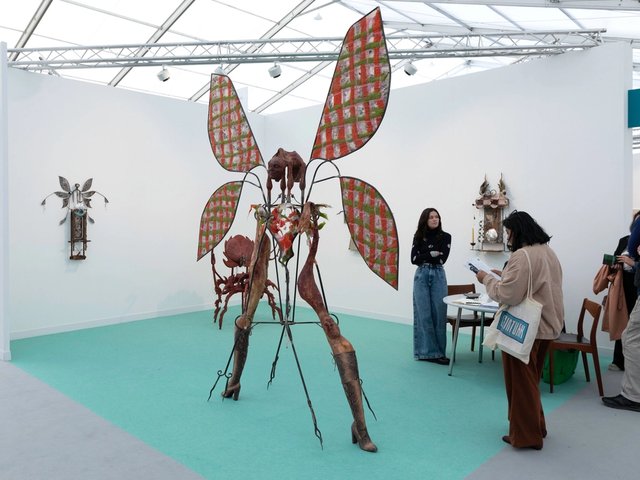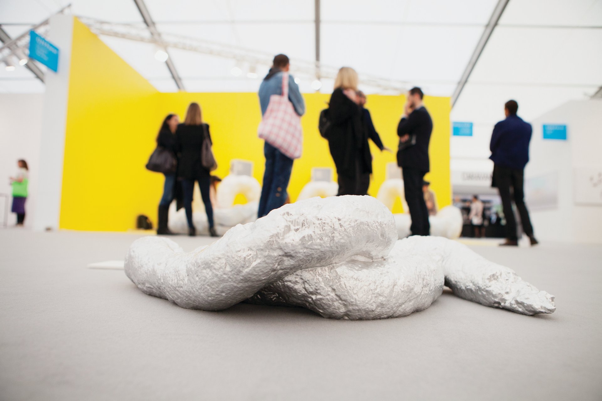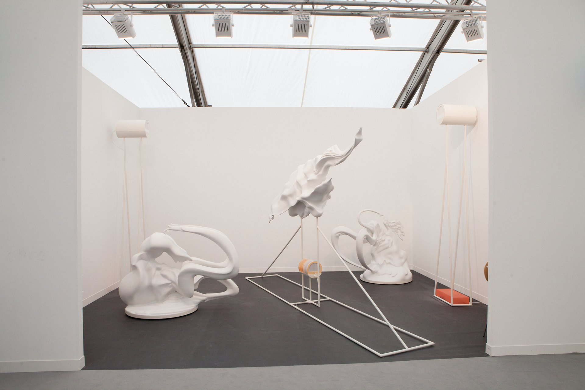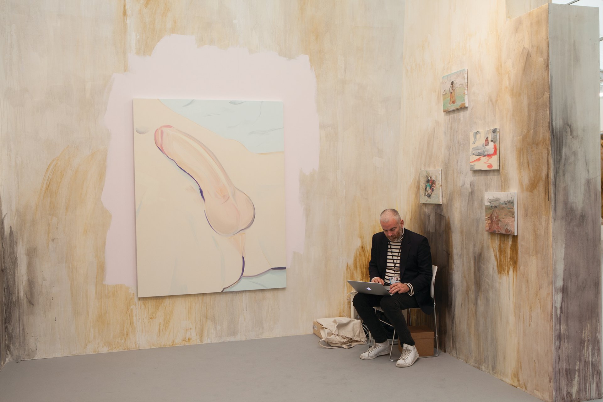 A provocative booth by the young British artist, whose recent paintings are hung on shaped walls covered in gestural painted marks made in situ at Frieze. Among them are large male nudes, focusing on the models’ penises. Made from life, they continue a series that began with depictions of her boyfriend, the artist Eddie Peake. Clear and candy-coloured, they contrast strongly with small paintings based on images Hempton found online, including depictions of an Isil beheading. History paintings for our time, these rough, dashed-off canvases speak to the immediacy of the source imagery and the inadequacy of responding to it in paint.