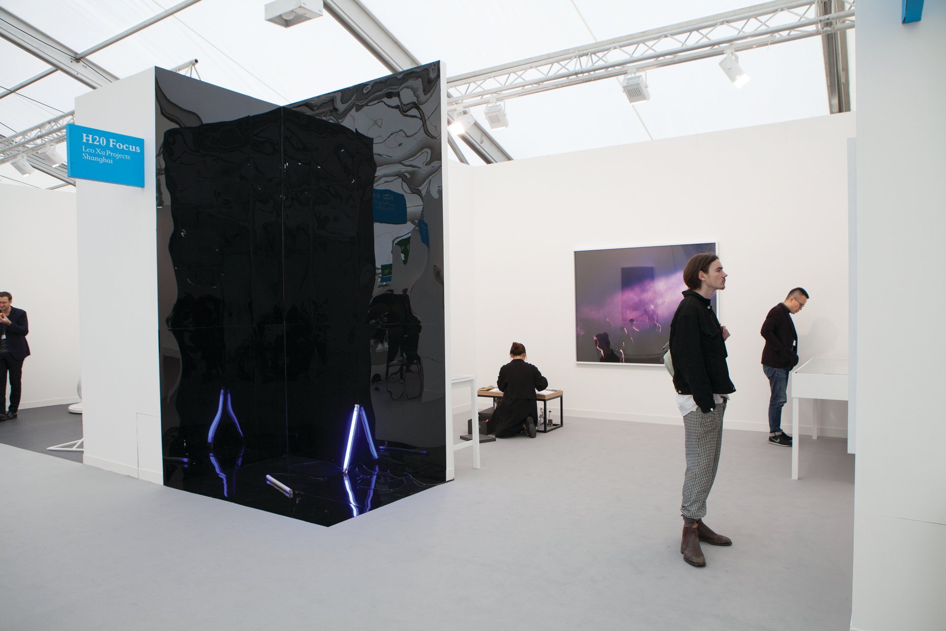 Humeau’s is a fast-rising star. Describing herself as an “Indiana Jones in Google times”, she has created a fictional world in which elephants are the first sentient beings. Research and conversations with zoologists and palaeontologists, among others, have led Humeau to fashion dramatic and futuristic forms from high-density foam coated in latex resin and white spray paint. This booth shows the death of her fantastical civilisation. Two animals are self-cannibalising, while a tall central elephant is depicted at the moment it eats a poisonous flower; its final agonised breath emerges from a speaker below the sculpture. Humeau has created an extraordinary ecosystem: visually alluring and absorbing in concept.