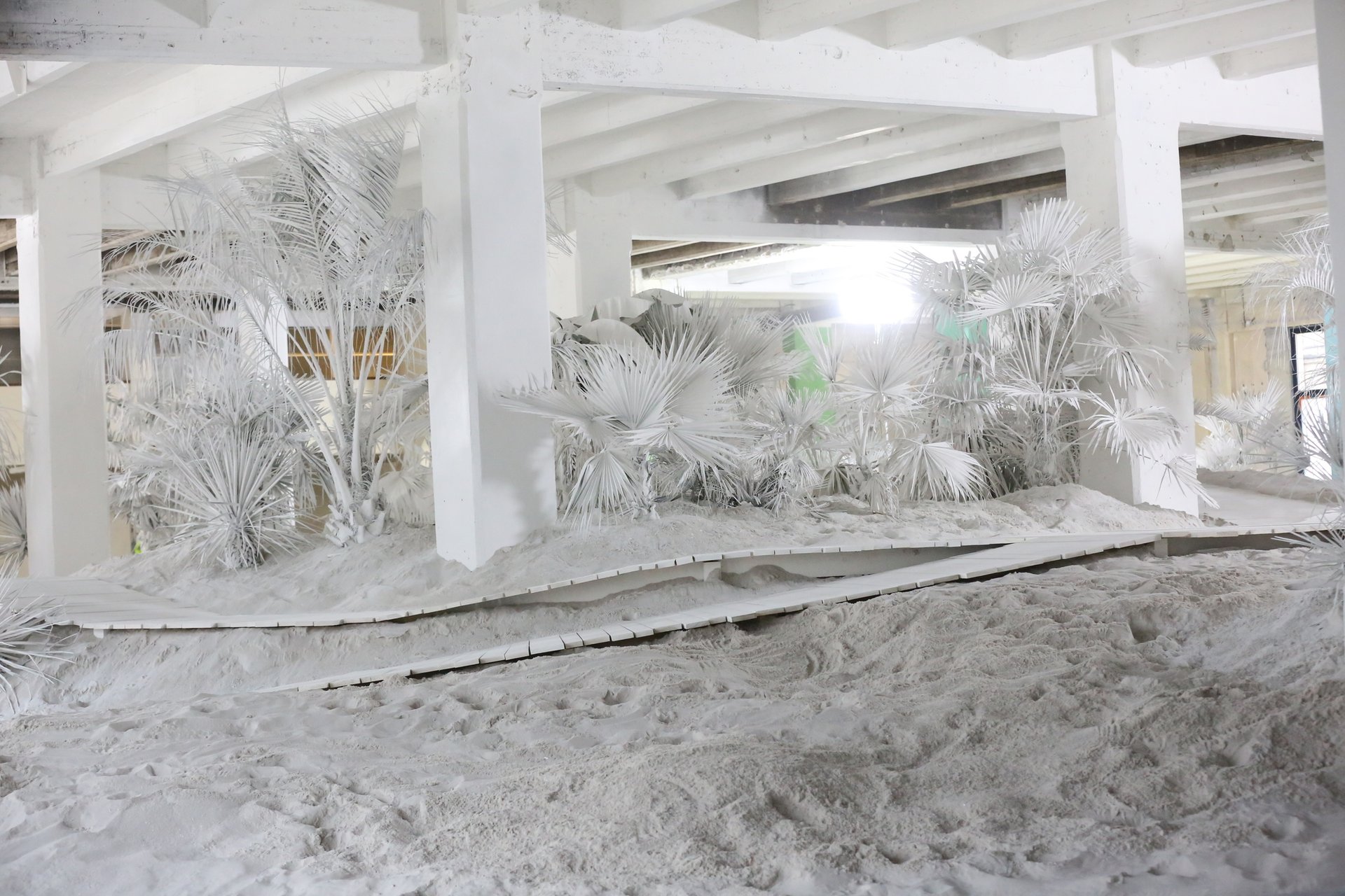 “It is made of sand, wood, glass crystals, plants—all materials used for the fabrication of the Martell Cognac bottles,” says a spokeswoman for Martell. “The entire piece is covered with white lime, creating an incredible effect. A white halo [of sand] spreads around the work and out under the visitors.”