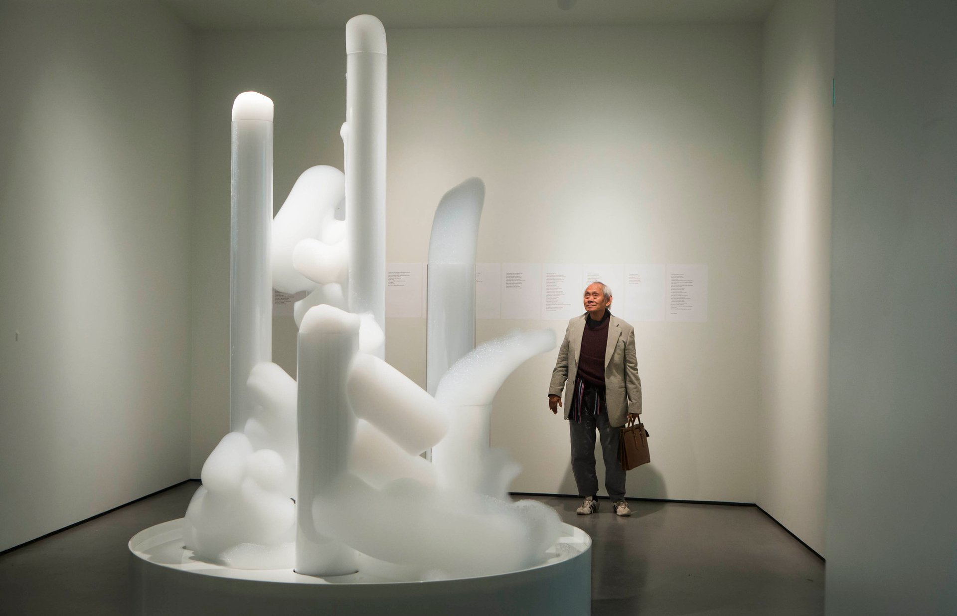 Barlow, who will represent Britain at next year’s Venice Biennale and was an influential teacher at the Slade School of Fine Art, has used her customary low-cost materials such as plywood, tape, sand and PVA glue to create a huge immersive installation. Claydon is showing work from his recent show at Sadie Coles HQ, including a yellow PVC curtain—commonly used for walk-in fridges—that he has scented with citronella. The Philippine-born Medalla, who is the oldest artist on the shortlist, is exhibiting his signature foam-producing sculptures that he began making in the 1960s.