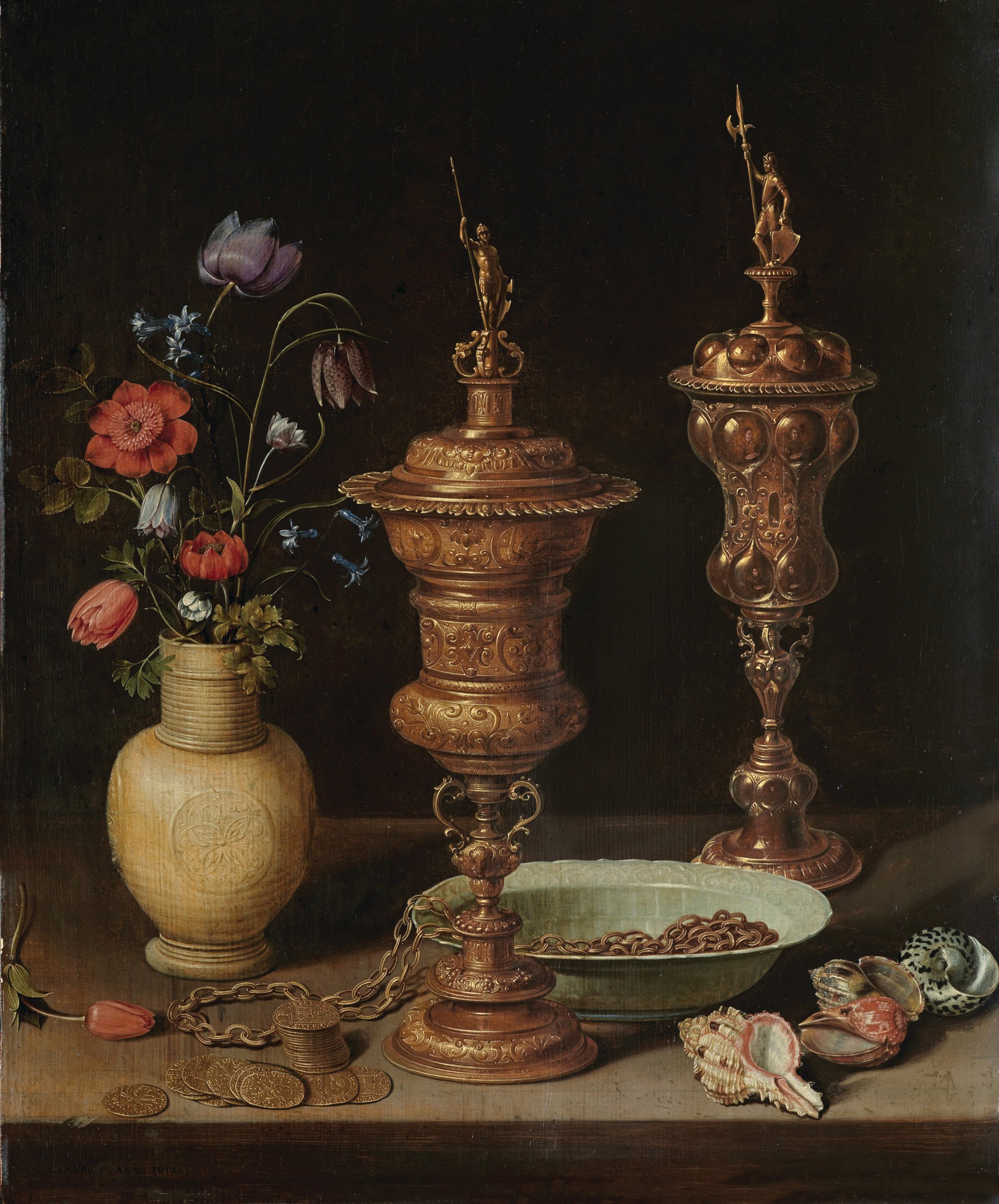 The exhibition, which includes six works from private collections and four from the Prado’s own holdings, offers fleeting glimpses of Peeters herself. The artist painted miniature self-portraits reflected in the polished tableware of her meticulous still-lifes. In the Prado’s Still Life with Flowers, Gilt Goblet, Almonds, Dried Fruits, Sweets, Biscuits, Wine and a Pewter Flagon (1611) she appears in a headdress and ruff reflected in the flagon, while in Still Life with Flowers, Gilt Goblets, Coins and Shells (1612), from the Staatliche Kunsthalle in Karlsruhe, she holds up her brushes and palette.