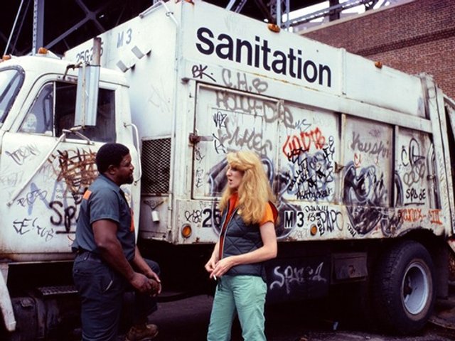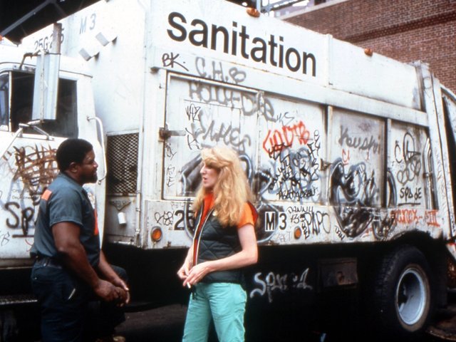 It was a prescient question. Since the late 1970s, Ukeles has been the official (but unpaid) artist-in-residence at the New York Department of Sanitation, partnering with workers and city officials to transform routine waste maintenance into an art practice. Her first work as resident, Maintaining NYC in Crisis: What Keeps NYC Alive? (1976), was a gesture of goodwill. In it, Ukeles shook the hands of every sanitation worker in the city—8,500 who worked across 59 districts—and thanked them for "keeping New York City alive." The work brought compassion to workers at a time when the department was undergoing tremendous financial difficulties and morale was low. At the Queens Museum, videos and photographs documenting this performance resonate with warmth and appreciation on both sides of the collaboration. It was the first of many works with the sanitation department, which have since included raucous and joyous “work ballets” choreographed with sanitation equipment, and a “ceremonial sweep” resembling a quirky line dance with brooms, performed by Ukeles, sanitation workers, and city officials as the grand finale of the 1983 New York City Arts Parade.