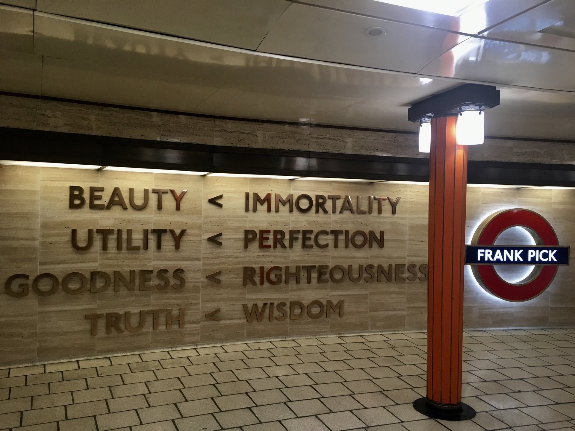 Langlands & Bell have risen to this considerable challenge with elegance and lightness of touch. Set into a curving travertine marble wall, in the station’s main ticket hall, is a classic illuminated roundel with Pick’s name in place of a station, along with eight words from Pick’s personal notes spelt out in solid bronze. These include “Beauty < Immortality”, which is the title of the piece.