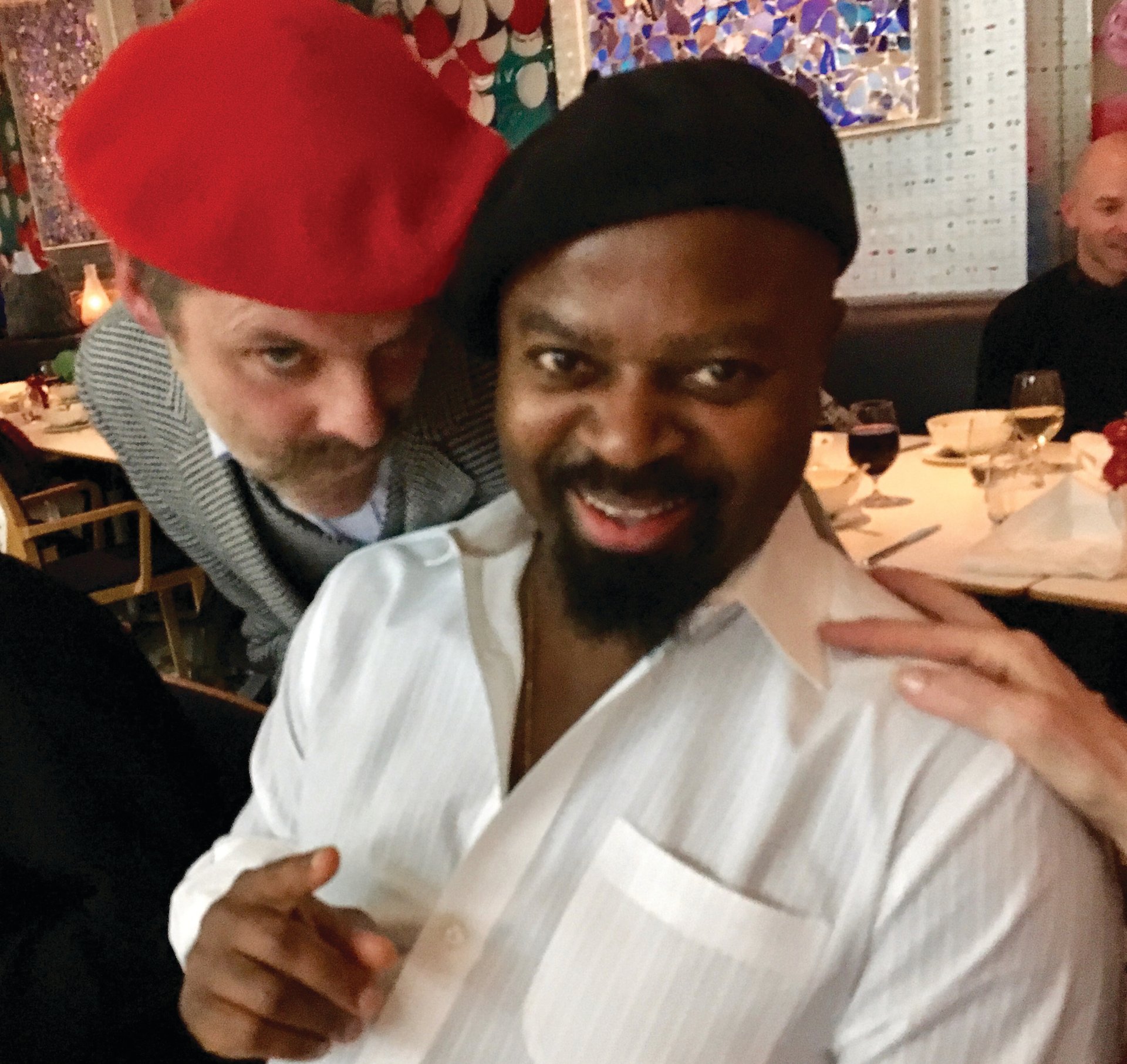 And shine Turk did, in a splendid scarlet beret which matched the rather more modest headgear of another of the evening’s illustrious attendees, the poet-novelist Ben Okri. Mr Okri currently seems to be earning a reputation as an art world scribe, writing extensive texts for both Turk’s exhibition catalogue and the book accompanying Langlands & Bell’s recent public commission for Piccadilly Circus underground station.