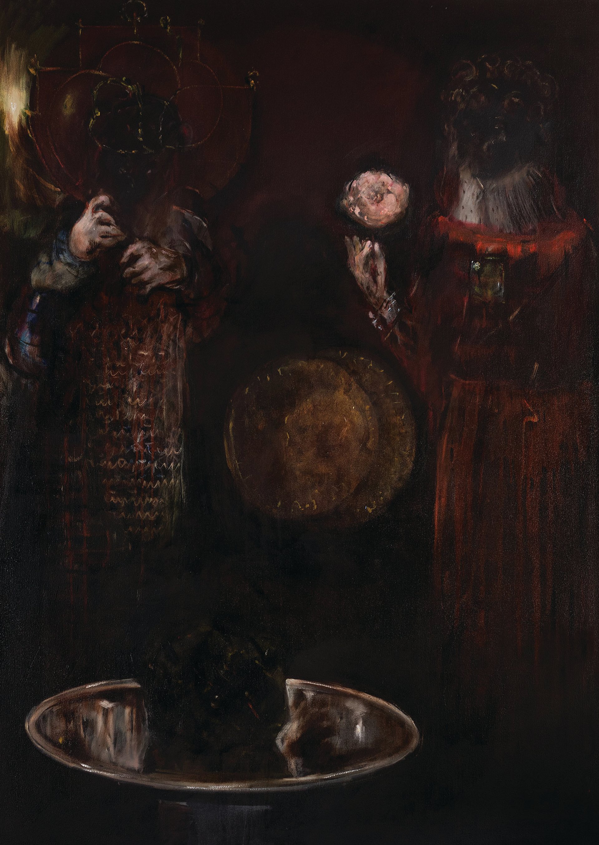 What strange, beguiling paintings these are. Mysterious spectral figures emerge from a richly painted Rembrandt-esque gloom, dressed in opulent fabrics but with their faces eerily obscured. Several are accompanied by iridescent glass orbs, which could also be the vanitas bubbles of 17th-century Dutch painting. There are flashes of glimmering gems, hands clasping delicate blooms and gleaming metalware. All this referencing and virtuoso brushwork conjures up a powerful and psychologically complex atmosphere that amounts to much more than spooky effects and Old Masterly quotations. These paintings take the traditions of memento mori and push them into a darker, more indefinable place.