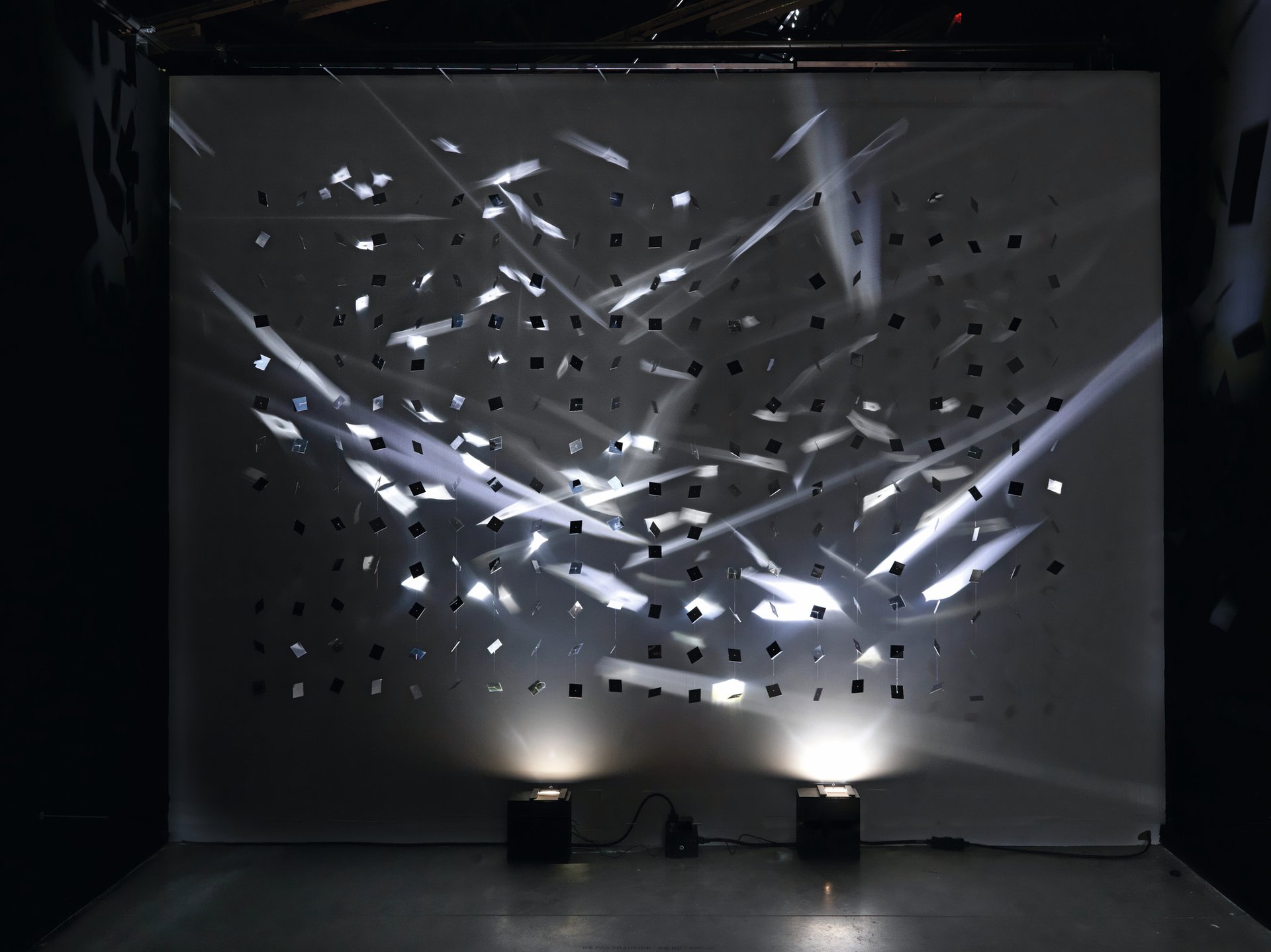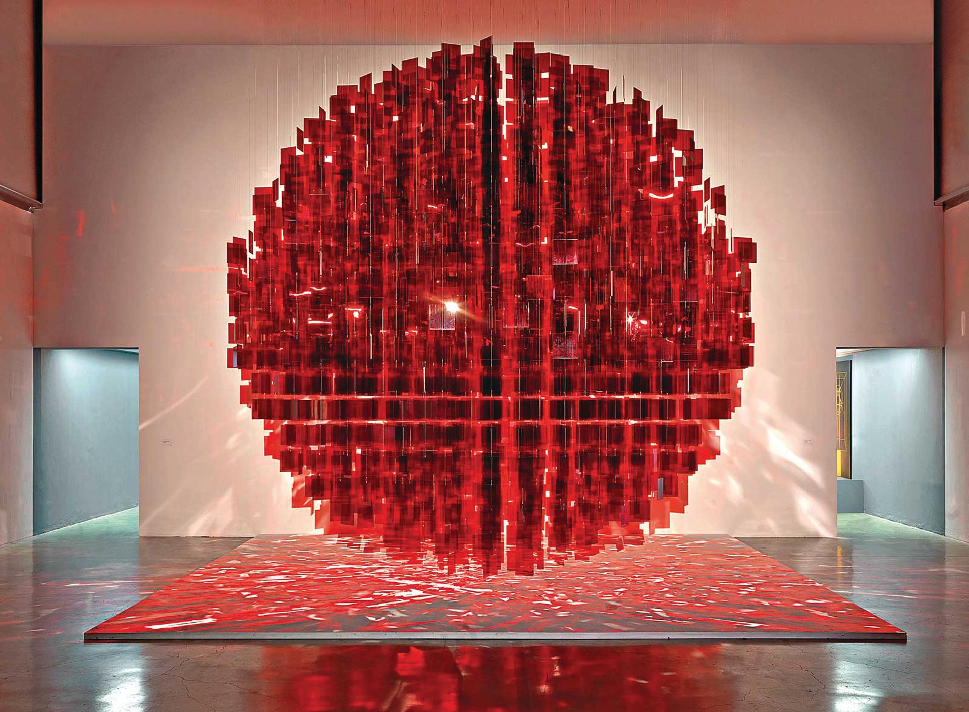 The show ends on a bold note with this large suspended work, which is more than three metres in diameter. Although it appears to be spherical, it is actually made of small, suspended Plexiglas squares.
